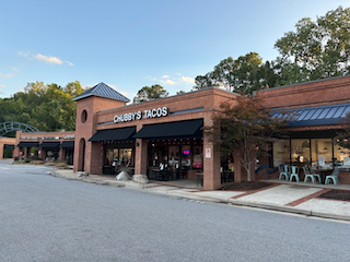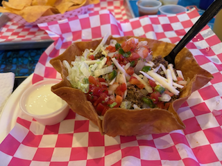 It became apparent that the band wouldn’t be playing soon (they were busy scarfing down pizza from Randy’s) and so we drained the last of our beers and drove around the corner to Chubby’s Tacos for dinner. A local chain with five locations in North Carolina and two in Texas, it’s an informal place where one orders food at one station and alcohol at the bar. We placed our order, the Birria Tacos (4 hour slow cooked Birria Tacos topped with onion, cilantro and served with consommé) for Joanna and the Taco Salad (Ground Beef, Shredded Lettuce, Refried Beans, and Sour Cream on the side) for me and then hit the bar for two El Jefe Margarita’s, served in large glasses and well worth the price.