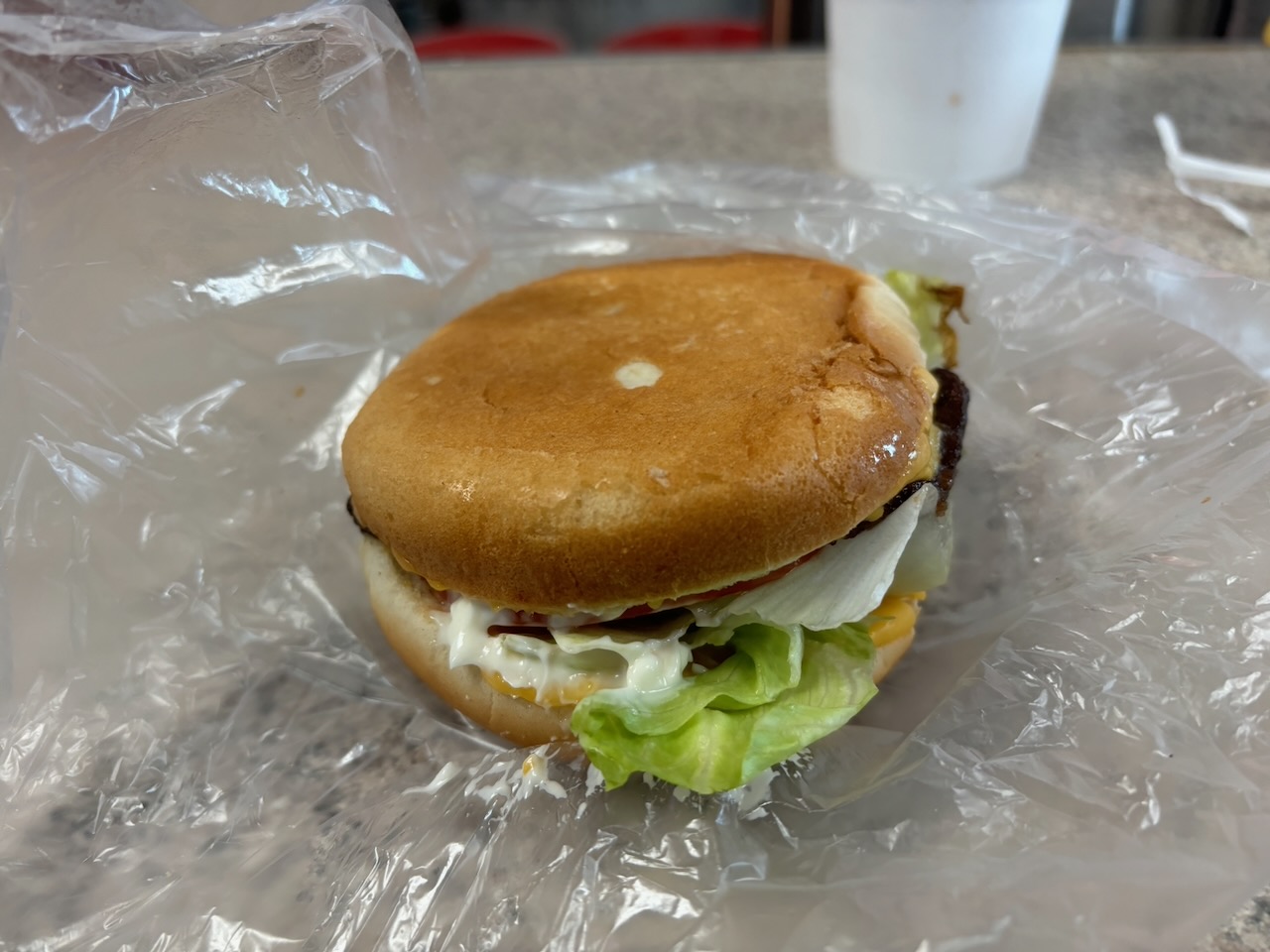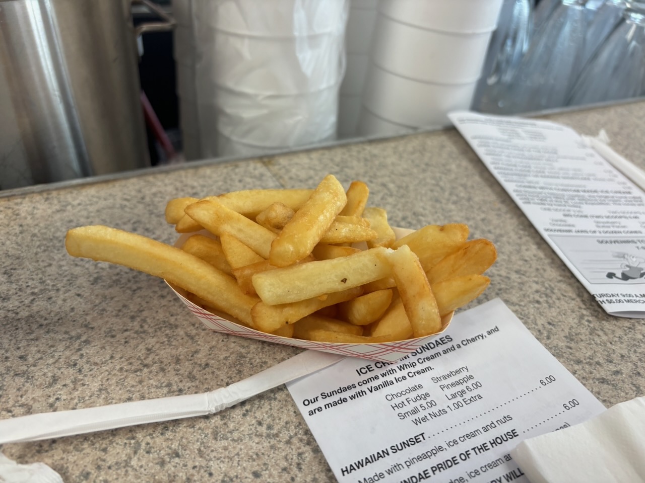 We went for broke when we ordered, the minced BBQ for Joanna and a cheeseburger for me, accompanied by an order of fries, a diet coke and a pumpkin shake. We finished it all off with a single dip ice cream cone. There isn’t anything fancy about this place. The burgers come out wrapped in some kind of film and you use that as your plate. Fries in paper tray, big enough to pour some ketchup into for dipping. It was all really good, and we left full to bursting for a total tab of $27.50 including a tip. Take that fast food joints.