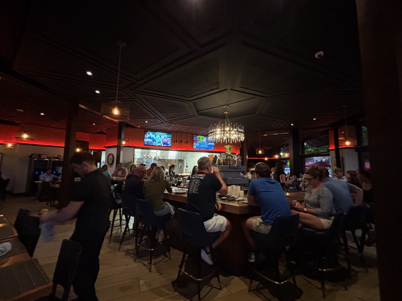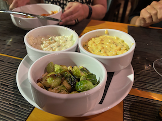 We all launched into main courses immediately, Joanna and I splitting the Kvaroy Salmon (Spinach Leaf, Parmigiana Risotto, Mushroom Tea, White Truffle Cloud) along with sides of Brussels Sprouts, Tillamook Mac and Cheese, and Parmigiana Risotto, that we shared with Dee and Richard. The Salmon was amazing, the White Truffle Cloud hovering above the perfectly cooked fish and not at all like any truffle we’ve consumed in the past. A good meal with good friends is one of the best ways to end our first couple of days in Charlotte, and there would be more.