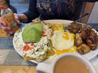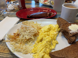 We survived the evening and the next morning before heading down to Diana and Jim’s house we met Debi, Kristen and baby Alexander at Breakfastime, a local chain with six locations near Charlotte and Winston Salem. It was crowded when we arrived and one look at the menu would explain why, enormous portions at ridiculously low prices. Joanna ordered the Chilaquiles special of the day while I thought I could do justice to the Corned Beef Hash and eggs. And surprise, neither of us came close to finishing.