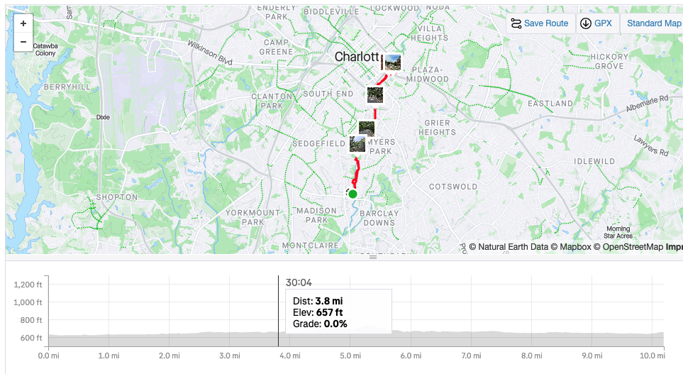 The next morning I dropped Joanna off at the Amelie’s in the Park Road Shopping Center to meet her good friend Dee while I parked and took off at the nearby trailhead for a ten mile ride on the Little Sugar Creek Greenway, a linear park and stream restoration project that when completed will consist of twenty miles of trails and paved walkways running from Cordelia Park just north of uptown Charlotte, then south through midtown Charlotte, and continuing all the way to the South Carolina state line. The Little Sugar Creek Greenway is a key part of the Cross Charlotte Trail (XCLT) and a segment in the Carolina Thread Trail, a regionwide network of trails that pass through 15 counties.