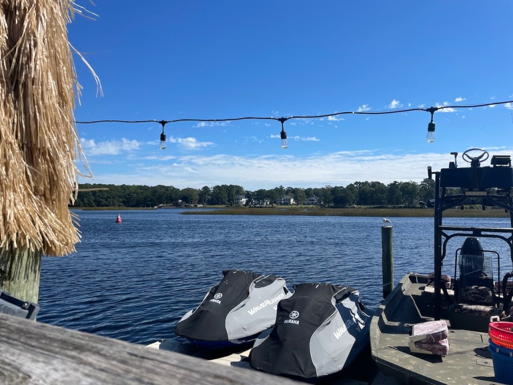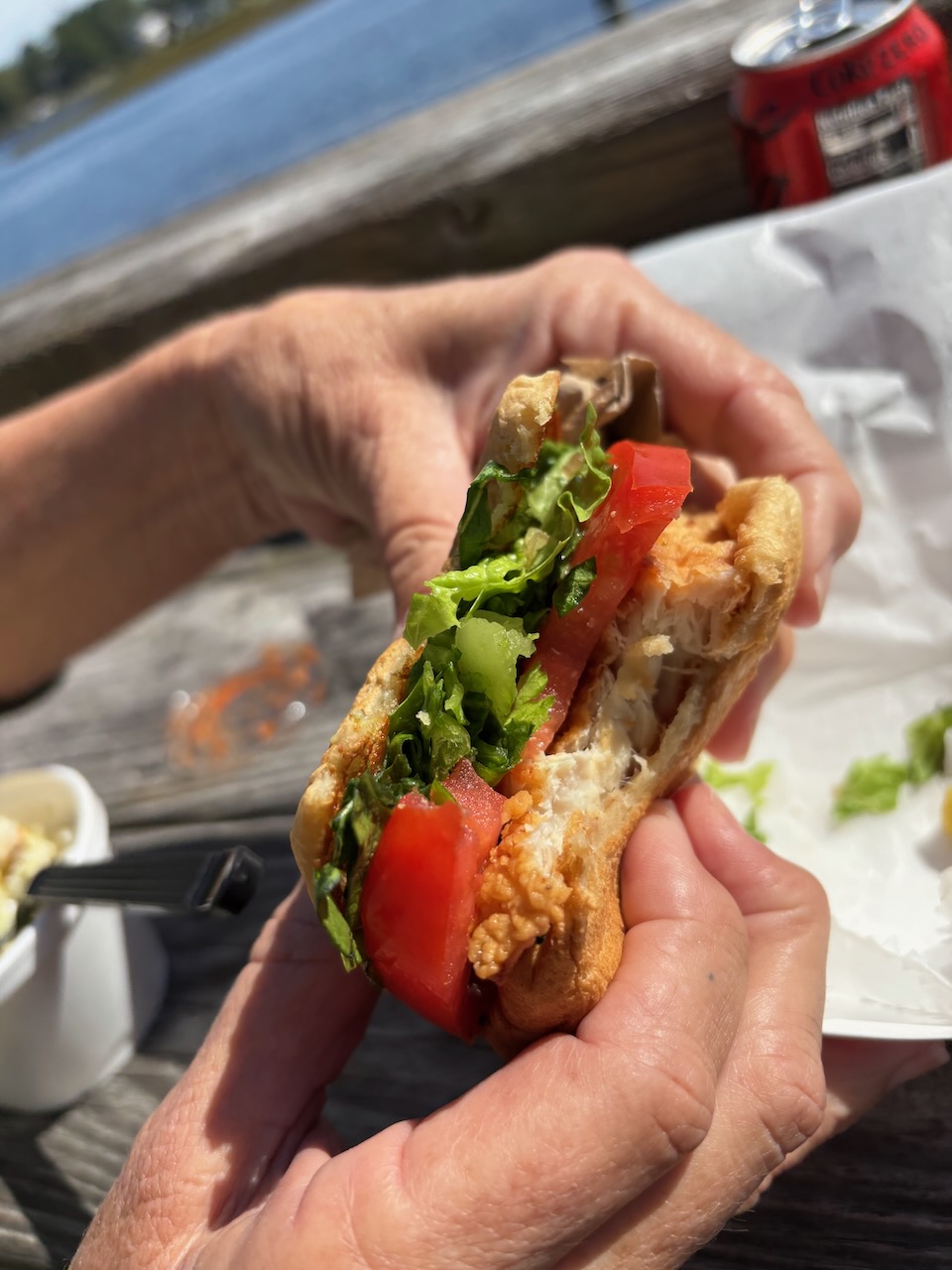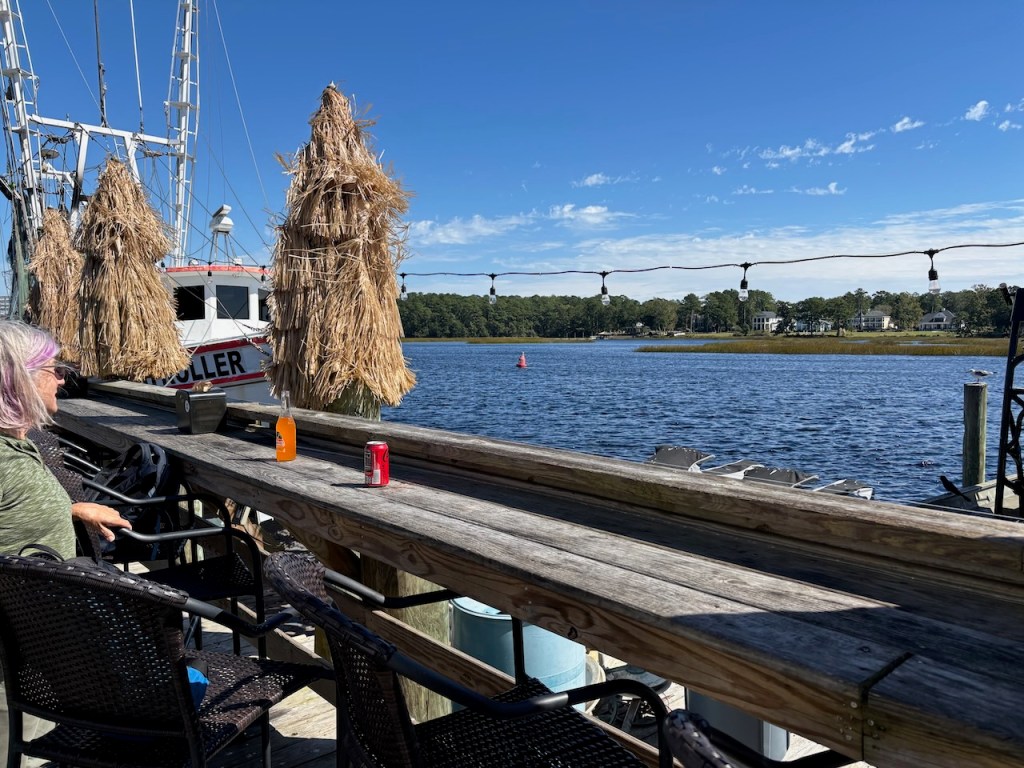 It was good to be out on the bikes although it wasn’t one of my better days in the saddle, but then not every ride is a winner. We returned to Bonnie’s place to drop off the bikes and shower and then drove to Calabash for lunch at a funky little place on the Calabash River called the Waterfront Seafood Shack. It’s a divey looking joint but boy was that food good. Knowing we’d be meeting other former Charlotte neighbors later for dinner, we held back and just split a fish sandwich, which was one of the best I can recall having.