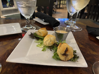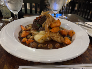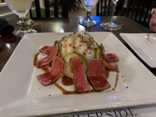 We started with drinks, a Pumpkin Spice Margarita for Joanna and a glass of Chardonnay for me as we enjoyed an appetizer of Mini Beef Wellington. Next, we all shared an Ahi Tuna dish with sliced cucumbers and a mound of spiced rice and completed the meal with a large serving of Beef Short Ribs with Mashed Potatoes, mushrooms, carrots, and a lovely gravy.