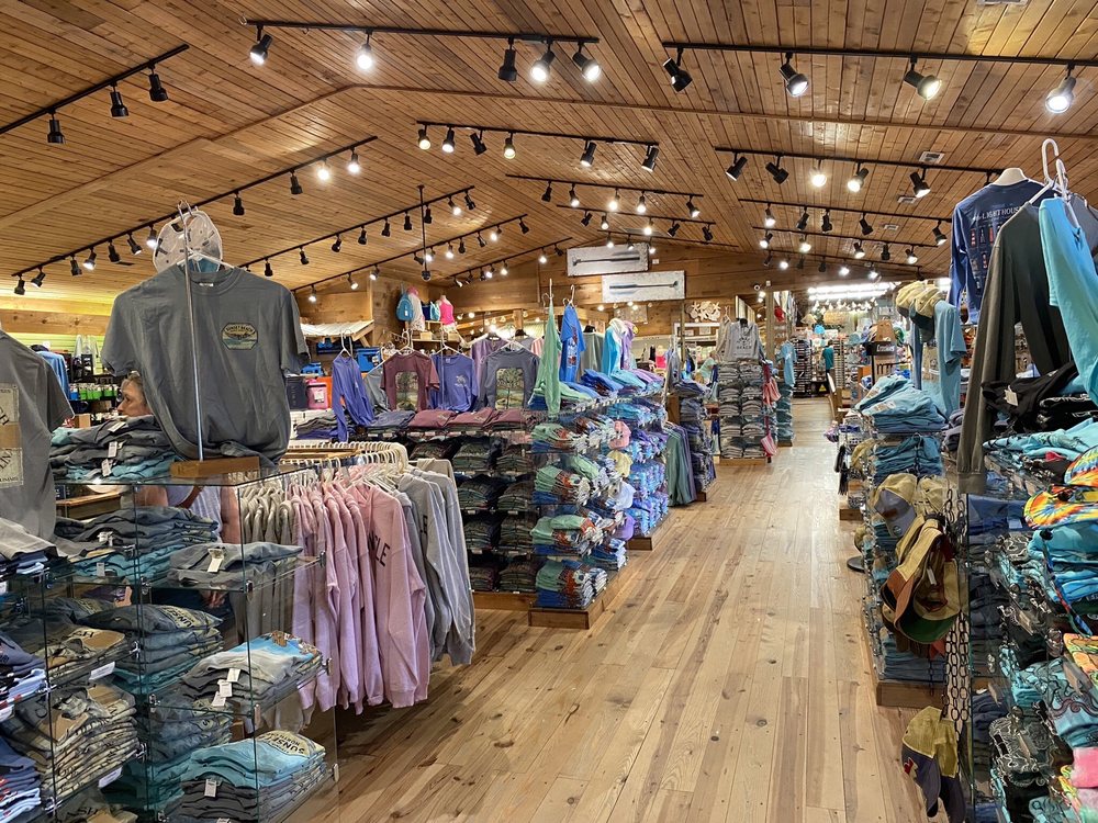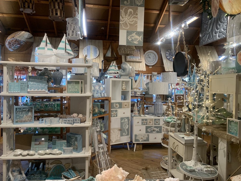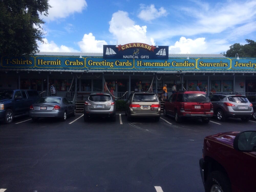 Not sure if there was indoor seating but the afternoon was so nice we sat outside perched on high top stools set against a fence overlooking the river, boats floating peacefully in front of us while various birds flew above and around our heads. We wolfed down our sandwich and then made a brief stop at Callahan’s of Calabash, a gigantic gift shop on Beach Drive where we were thwarted in our efforts to buy some post cards, a commodity we found it hard to come by in an area where one would think they’d be abundant.