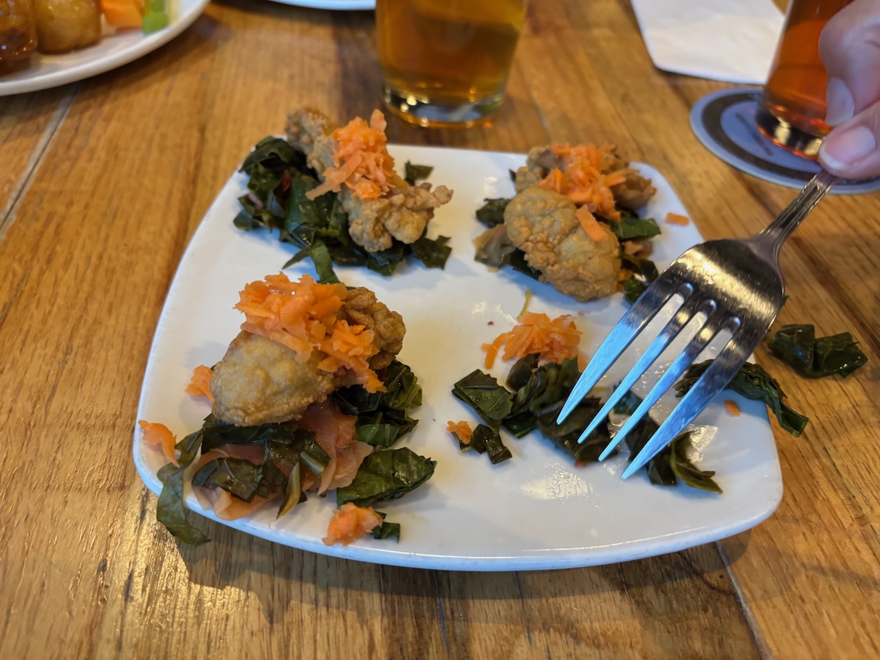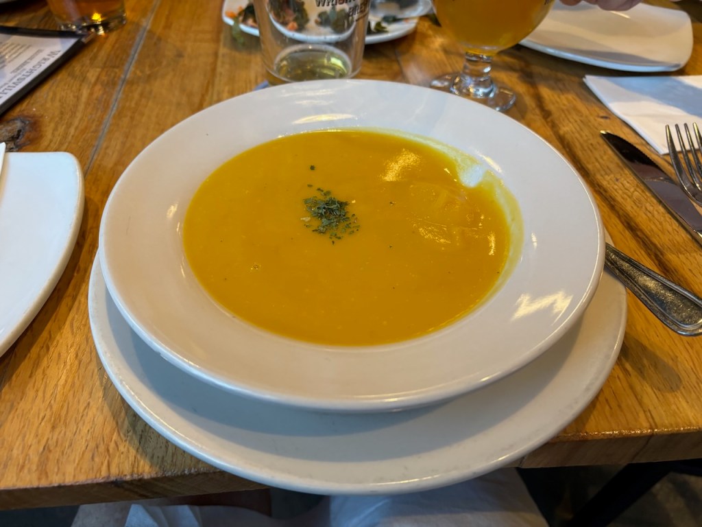Upon arrival Joanna ordered a Raspberry Berliner Weiss while I went for the Plover Pilsner that we would employ while enjoying a bowl of the soup of the day, a tasty Butternut Squash soup. Joanna ordered the Fried Oyster Bites (8 Fried oysters over kimchi spiced NC collards) which I will admit, I actually enjoyed, contrary to my prior interactions with this much beloved snack.