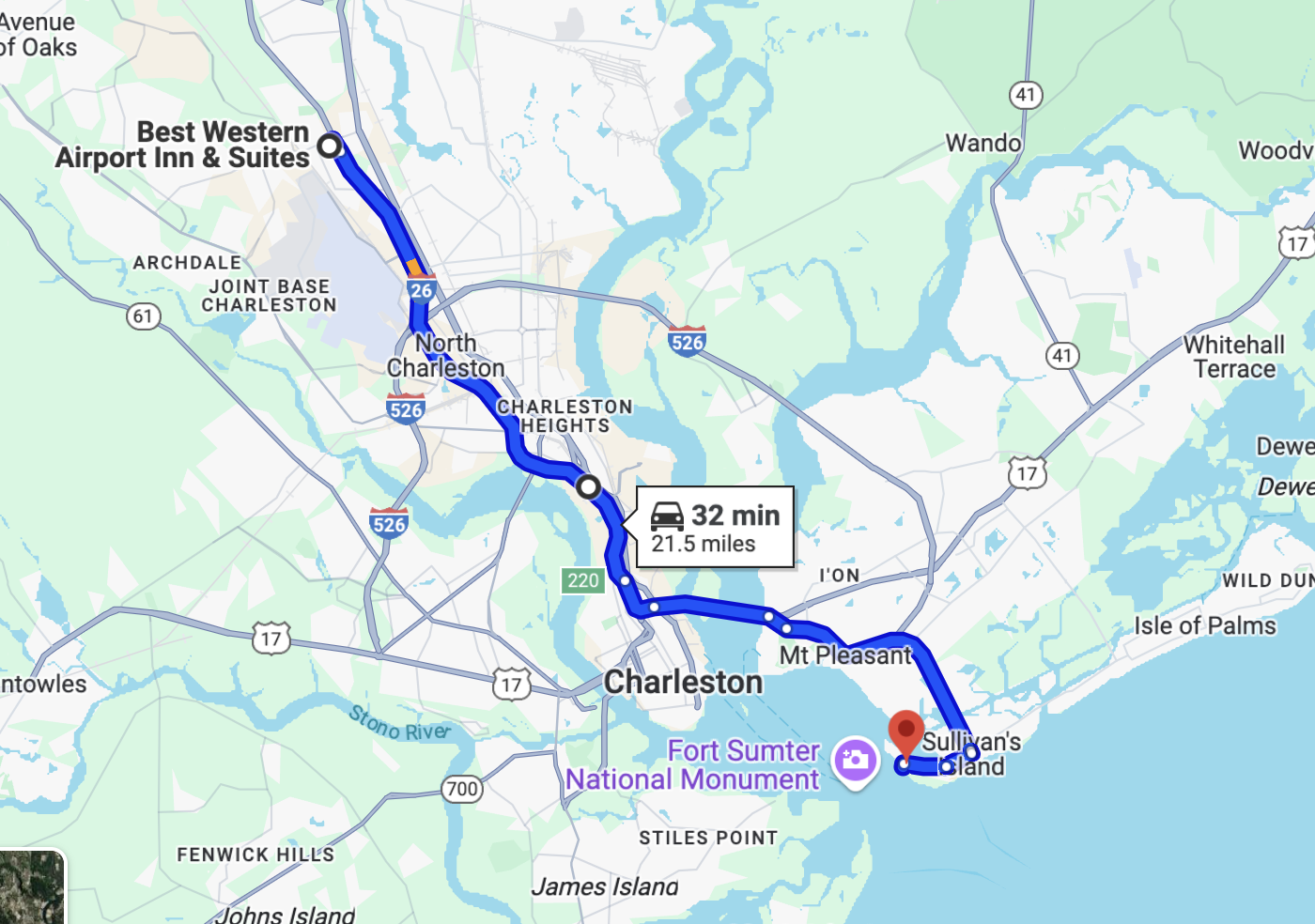 Our drive to Charleston would last a little under four hours and take place mostly on the road we’d taken to Bonnie’s place at Sunset Beach. Soon enough we landed at the Best Western Airport Inn and Suites, our home for the next two nights. We’ve accrued quite a few reward points with the chain and thus I think we were honored with a large two room suite on one of the top floors, a nice perk when you can get it.
