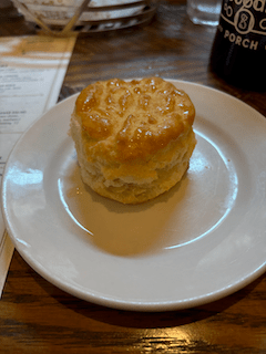 Erected in 1891 as a private residence, in 1976 the character of the neighborhood had changed suitably to allow for the conversion of the house into a restaurant. The last residential owners of the site sold their home and moved away, leaving behind the neighborhood dog, Poogan, thus providing a name for this cool restaurant in the heart of Charleston. Starting with house Bloody Mary’s to sip while we quickly eliminated the complimentary buttermilk biscuits we were served; we moved on to Pimento Cheese Fritters with Bacon jam that really hit the spot.