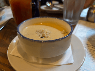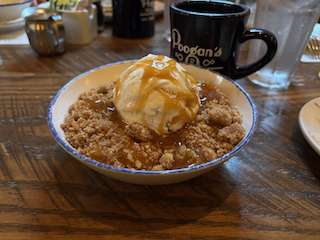 Next up we split a bowl of the She-Crab Soup (Seasoned blue crab, chives) which was very nice and to put the finishing touches on our meal, we closed out with a large serving of the Cast Iron Apple Cobbler (Biscuit streusel, vanilla bean ice cream, caramel sauce). Not exactly your typical brunch fare, but it was just what the doctor ordered after the crashing start to our morning. We happily paid the $87 tab, including tip, for a nice meal in a unique environment.