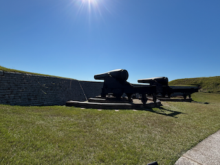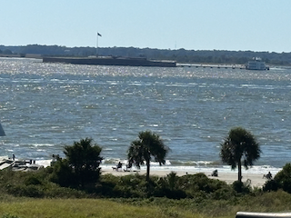 With an afternoon to fill before meeting Susan and Shawn again, we drove 30 minutes to Sullivan’s Island to visit Fort Moultrie. Now part of the National Historic Park that also includes Fort Sumter, it is a series of fortifications built to protect the city of Charleston. The first fort, formerly named Fort Sullivan, built of palmetto logs, inspired the flag and nickname of South Carolina, as “The Palmetto State”. The fort was renamed for the U.S. patriot commander in the Battle of Sullivan’s Island, General William Moultrie who took command in 1776.