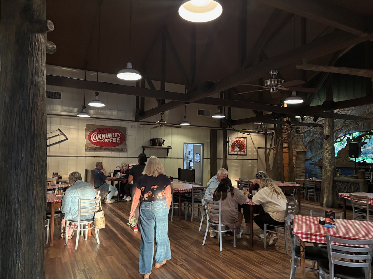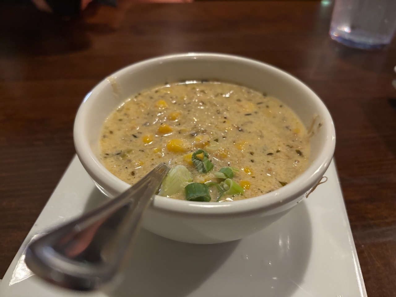 Later, after relaxing at the house and digesting our ice cream, we made our way to the highly recommended Prejean’s for dinner. Located on the northern outskirts of town it’s a large establishment that highlights Cajun cuisine, which curiously, we wouldn’t sample while there, instead ordering fairly standard items. Joanna ordered a French 77 (gin, elderflower liqueur, lemon juice, and champagne), to start while I enjoyed a Bulleit Rye Old Fashioned, both of which went well with the bowl of Corn Chowder that we started with.