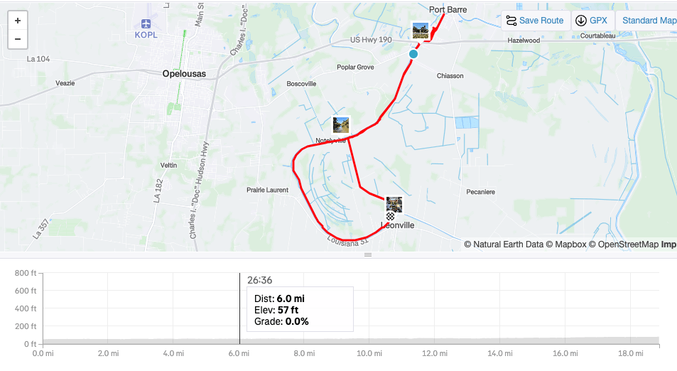 Pedaling through flat countryside, we returned to the car in Leonville and grabbed a quick lunch of a smoked turkey sandwich and a Frostop Vanilla Caramel and Crème soda at Champagne’s Marche, a good sized place out in the country. We’re not talking gourmet here, but the quality was good and it did what we needed it to do, that is assuage our hunger but not fill us up, leaving room for dinner later.