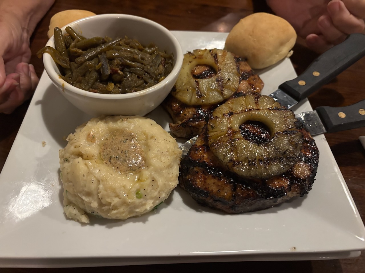 I then ordered a La Crema Pinot Noir to accompany the Pork Ribeye entrée that included two pieces that had been brined and larded and were topped with grilled pineapple slices and served with green beans, garlic mashed potatoes and a dinner roll. Joanna opted for a half dozen Oysters on the half shell. Although a little disappointed that we weren’t sampling true Cajun offerings, we had no complaints about the portion sizes or quality of what we did enjoy, checking out with a tab of $122 including tip and tax.