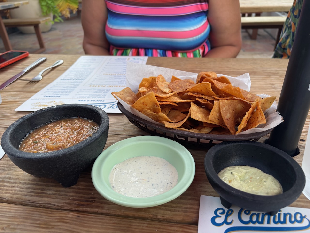 By now hunger had set in and a block or two away was our destination, El Camino Comida and Bar. We’d power through a couple of pitchers of good and strong margaritas while demolishing a basket or so of chips and salsas. Seated on the patio, the warm air cradling us I can’t think of a better place to be than with friends sharing the experience.