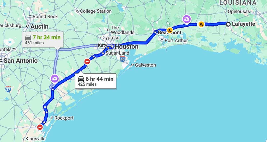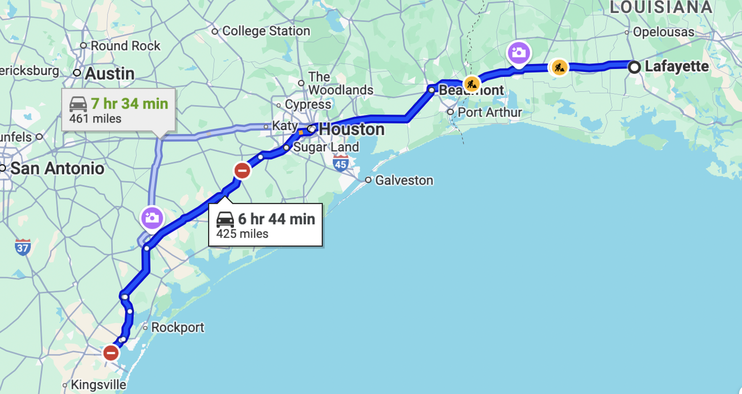 We were making good time once we got on the road until we got to Vinton, Louisiana and hit a full stop traffic jam. We would move inch by inch a few feet at a time, making little progress, keen to know what was holding us up. Was it construction or an accident? We would never find out. This wasn’t the first time we’d hit turbulence on this stretch of road, indeed traveling in this direction a few years back when the Sabine River, which forms the border between Texas and Louisiana, flooded and closed the highway. We were able to detour, but it added many hours to the journey.