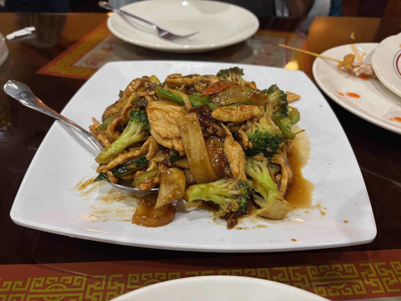 It was all good and a perfect lead into the entrée we split, the Chicken with Mixed Vegetables (Sliced white meat chicken sauteed with zucchini, broccoli, water chestnuts, bamboo, mushrooms, snow peas, onion, and carrots in brown sauce). We managed to eat almost all of it, taking just a bit back to the room to ferry home in the ice chest. The tab came to a very reasonable $60, well worth it for the quality of the food and the excellent service we received.