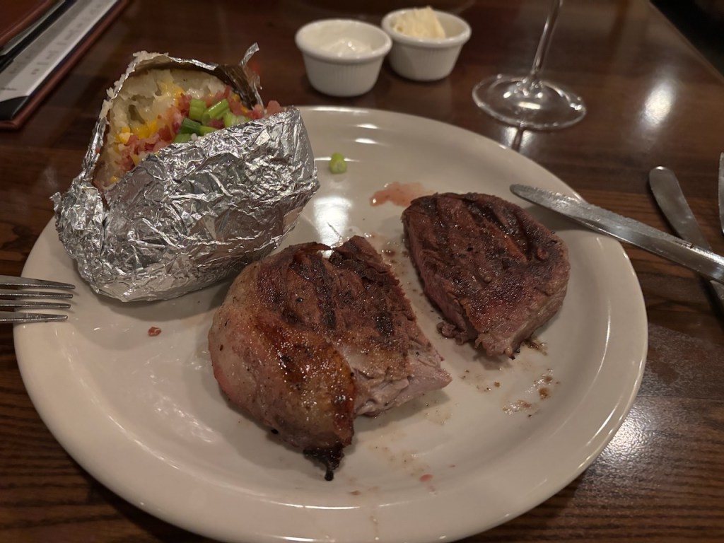We checked in to the Holiday Inn, and then met Kemet at the Cattle Baron for dinner. After being seated and ordering, Joanna would enjoy the Green Chili Stew (top sirloin, green Chile tomatoes. Served with a flour tortilla.) while I had the Filet Mignon with a baked potato, which was good, particularly at just $34. Along the way a gin and tonic and very reasonably priced glasses of Pinot Noir were consumed. All in all, it was a satisfying and filling meal.