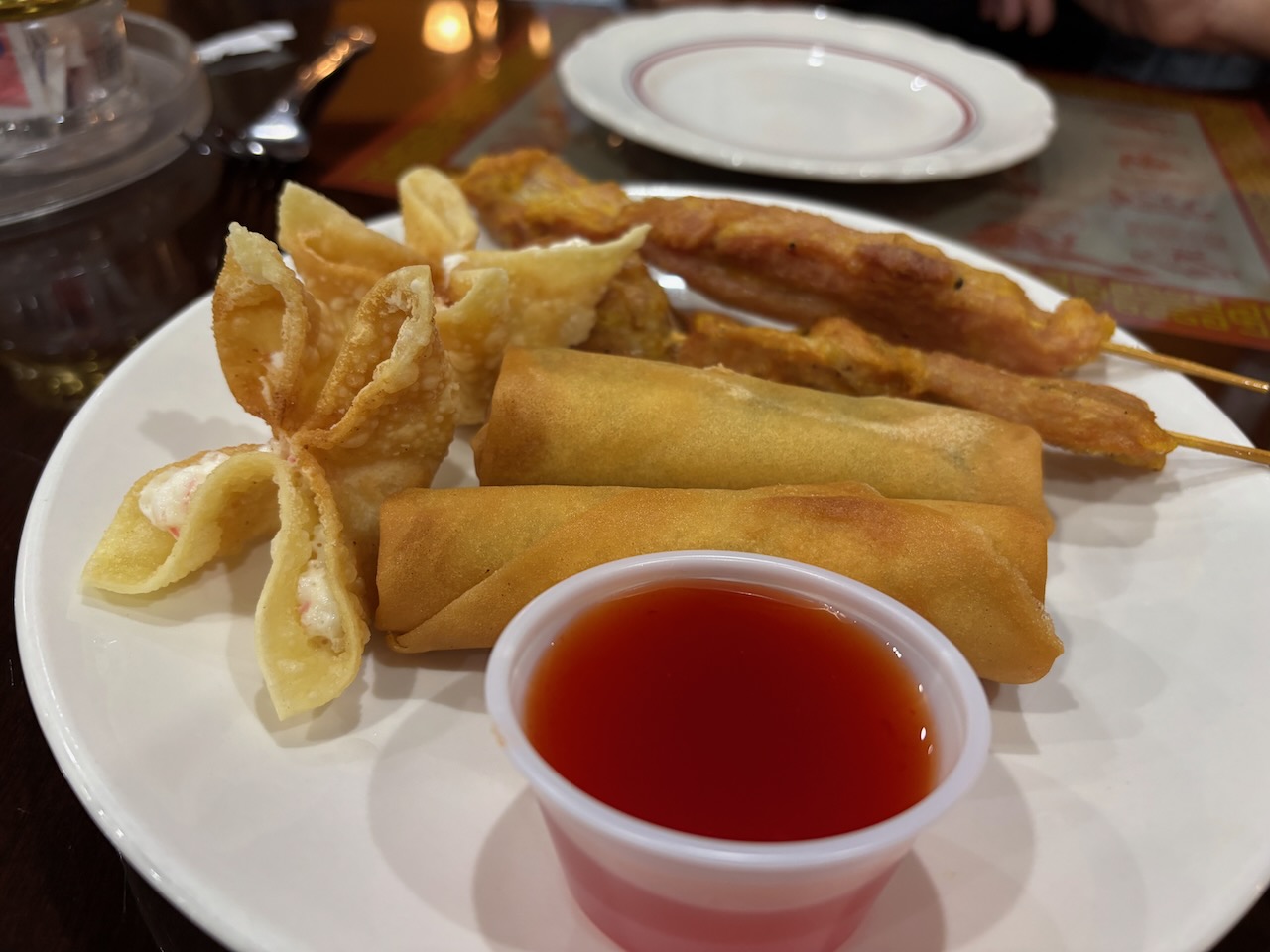 Perhaps because of our rewards status we were assigned the same two room suite we had before, which means storing the bikes is much easier. Given the long drive and the detour to the museum, we didn’t feel like driving in downtown and so opted to walk around the block to Golden Dragon Chinese Cuisine restaurant for our last dinner of the trip. We started off with a bottle of Tsing Tao beer apiece to wash down our Pupu Platter (2 spring rolls, 2 crab puffs, 2 chicken sticks).