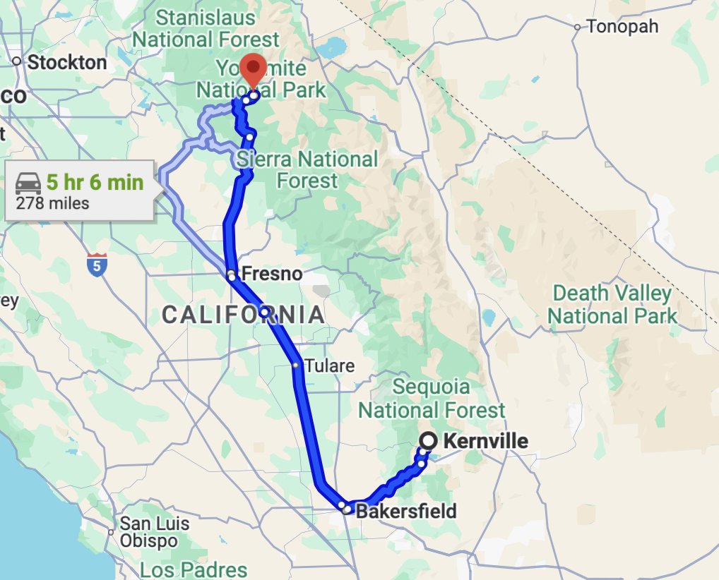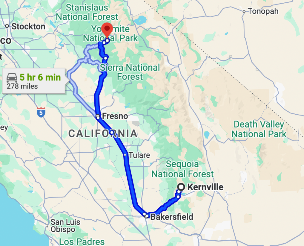 On the way out of town we stopped at Sequoia Mountain Bakery, where I picked up a very good scone to go with the thermos of coffee I’d made back in the room, preparing for the nearly six hour drive in front of me. Marty would join me for the ride, making the time fly by as we again navigated that narrow canyon back down to Bakersfield, and the drove north on Highway 99 to Fresno where we jumped on Highway 41 through Oakhurst and into the park.