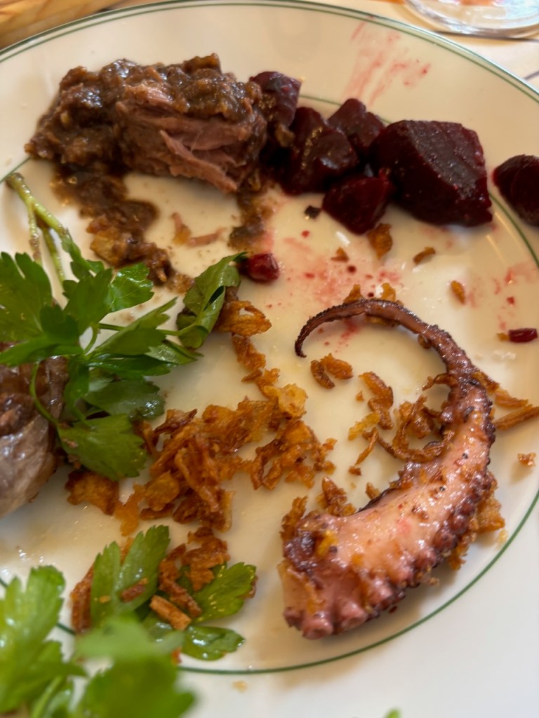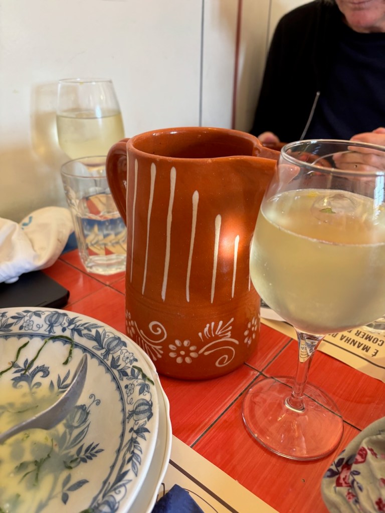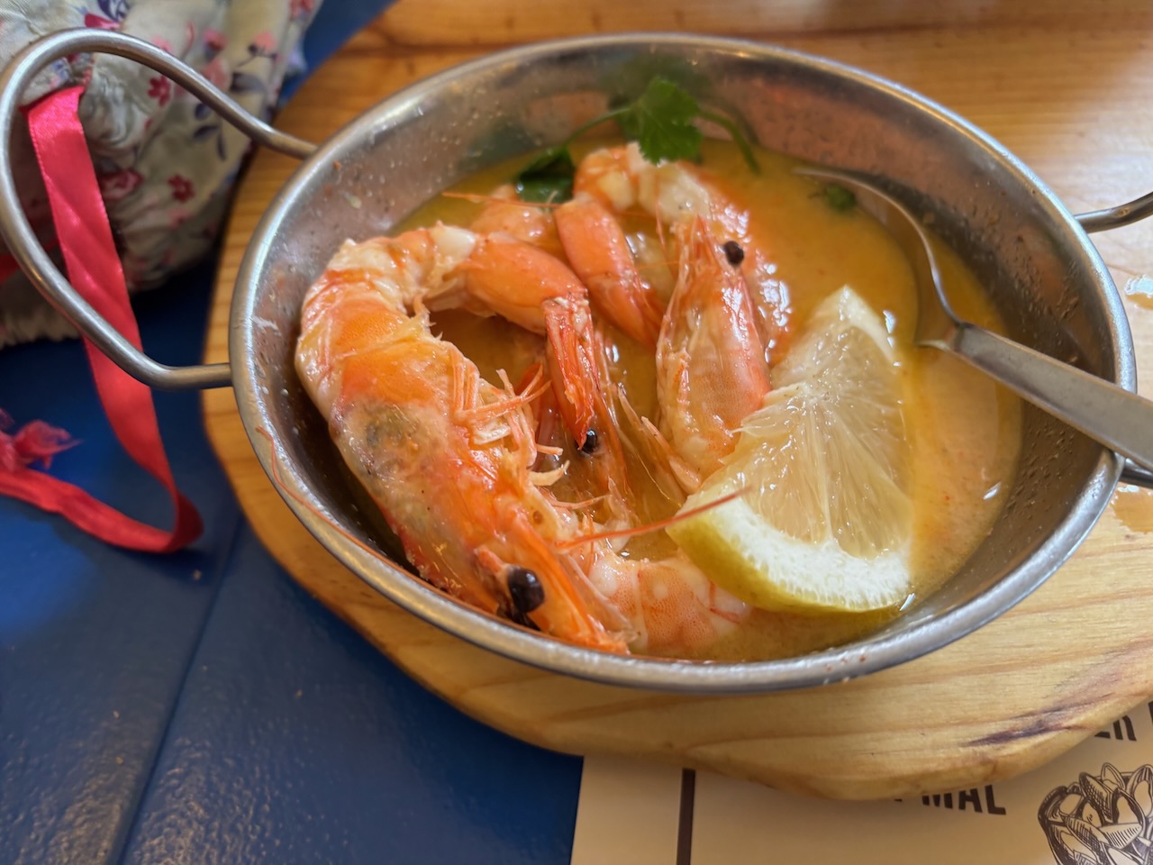 Our timing was just right because as we were finishing up, we got a text from the others letting us know the table was ready and to hustle on over. The menu is comprised of tapas, sandwiches, and soups and we would sample quite a few, more than ten, all very good. From what I can recall we’d enjoy shrimp in broth, Octopus blades “lagareiro” style, Candied pork cheeks confit w/ mushrooms accompanied by two large roasted potatoes, a host of other items and of course, two jars of Sangria. And as we’d experienced so far in Portugal, the tab came to a reasonable 125 Euros.