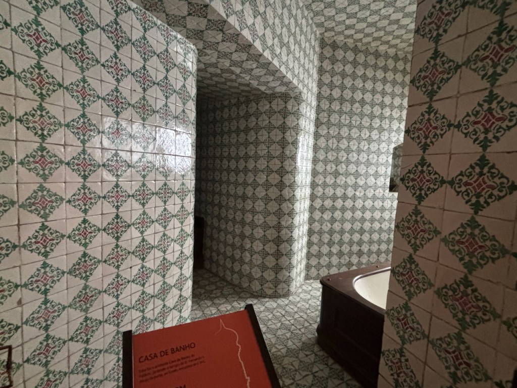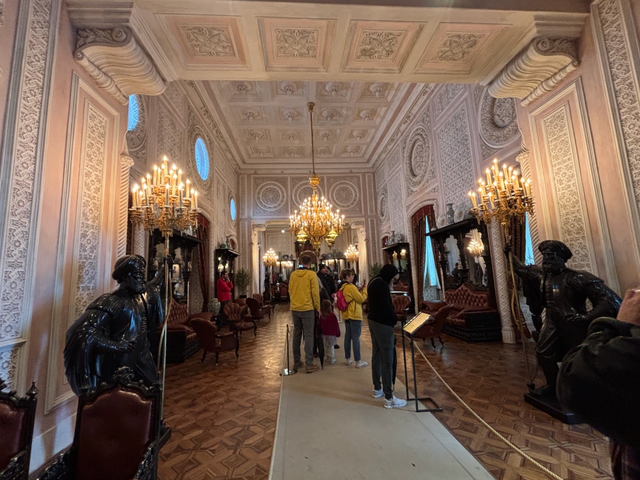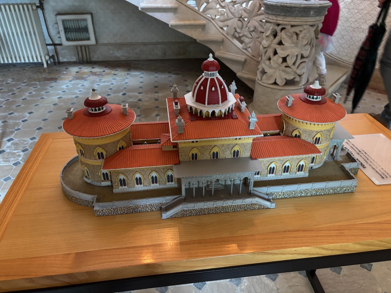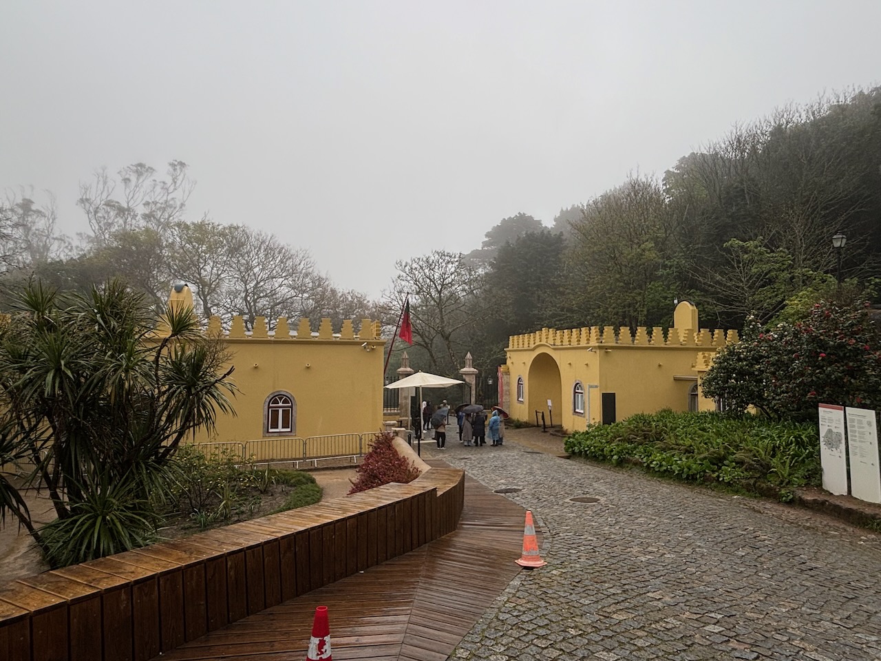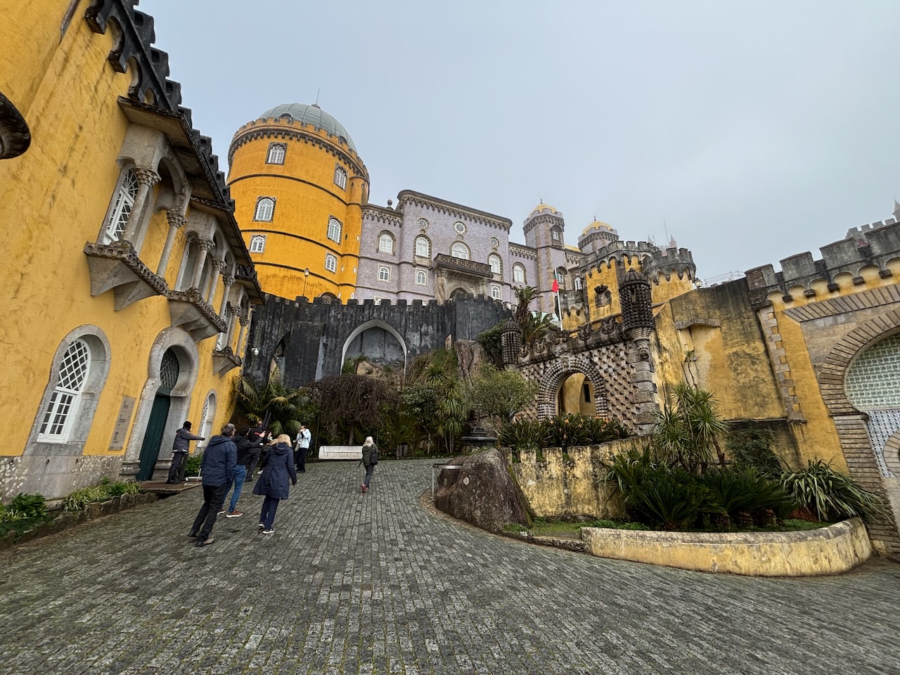 After a little less than an hour’s drive we arrived at Pena Palace, a Romanticist castle, in drizzling rain, handing out the extra umbrella’s our driver had thoughtfully brought along, which would make the rest of the day manageable. We scanned our tickets at the booth and entered a courtyard where we soon caught a shuttle that would take us up the hill to where our tour would start.