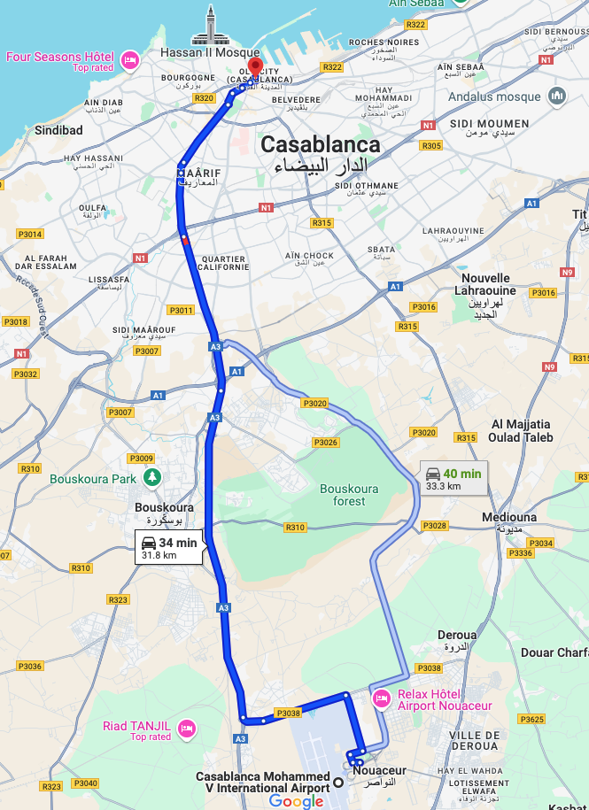 We landed in Casablanca, cleared customs, retrieved our bags and exiting looked around for the driver who was to meet us. For this tour, and many others, Intrepid included free pickup from the airport if you were being transported to the lodging provided for by the tour. Since we were coming in a day early, I asked them to book us into that hotel at their rate, which is usually competitive and allows for us to not have to change rooms once the tour starts.