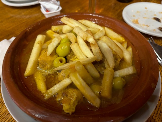 I ordered a chicken tagine, the first of what would be many of this dish, as it seemed like I would eat one at every other meal. A tagine or tajine is a Maghrebi dish, and also the earthenware pot in which it is cooked. According to some sources, it’s history dates to the time of Harun al-Rashid, the fifth Abbasid Caliph. The concept of cooking in a tajine appears in the famous One Thousand and One Nights, an Arabic-language story collection from the 9th century.