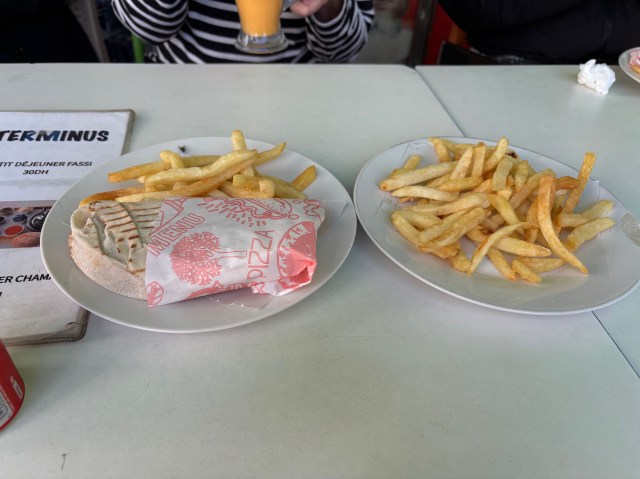 Discouraged we braved a taxi back to the hotel and A bit hungry by now, Joanna and I walked across the street to a small, crowded café and split a chicken wrap with fries and a Diet Coke. The wrap was very good, nicely cooked chicken with tomatoes and lettuce, and along with the fries enough to old us over until dinner. We returned to the hotel and hung out until it was time to head down to Cities to meet our tour guide and the other participants. We’ll detail that meeting, our dinner that night, and our tour of the grand Mosque on the way out of town the next day in our next post. See you then.