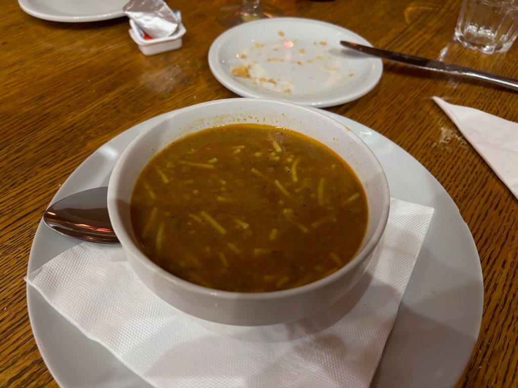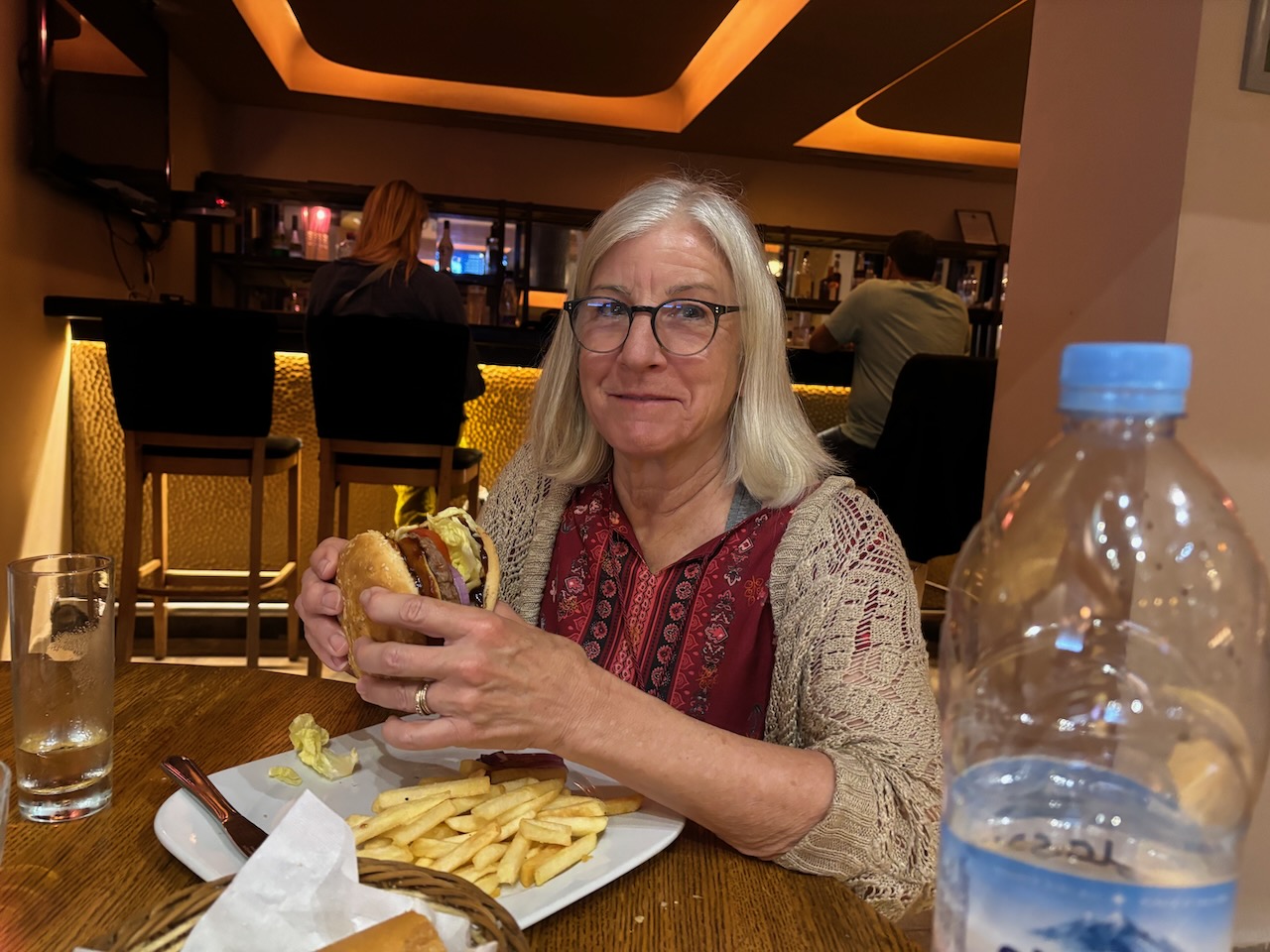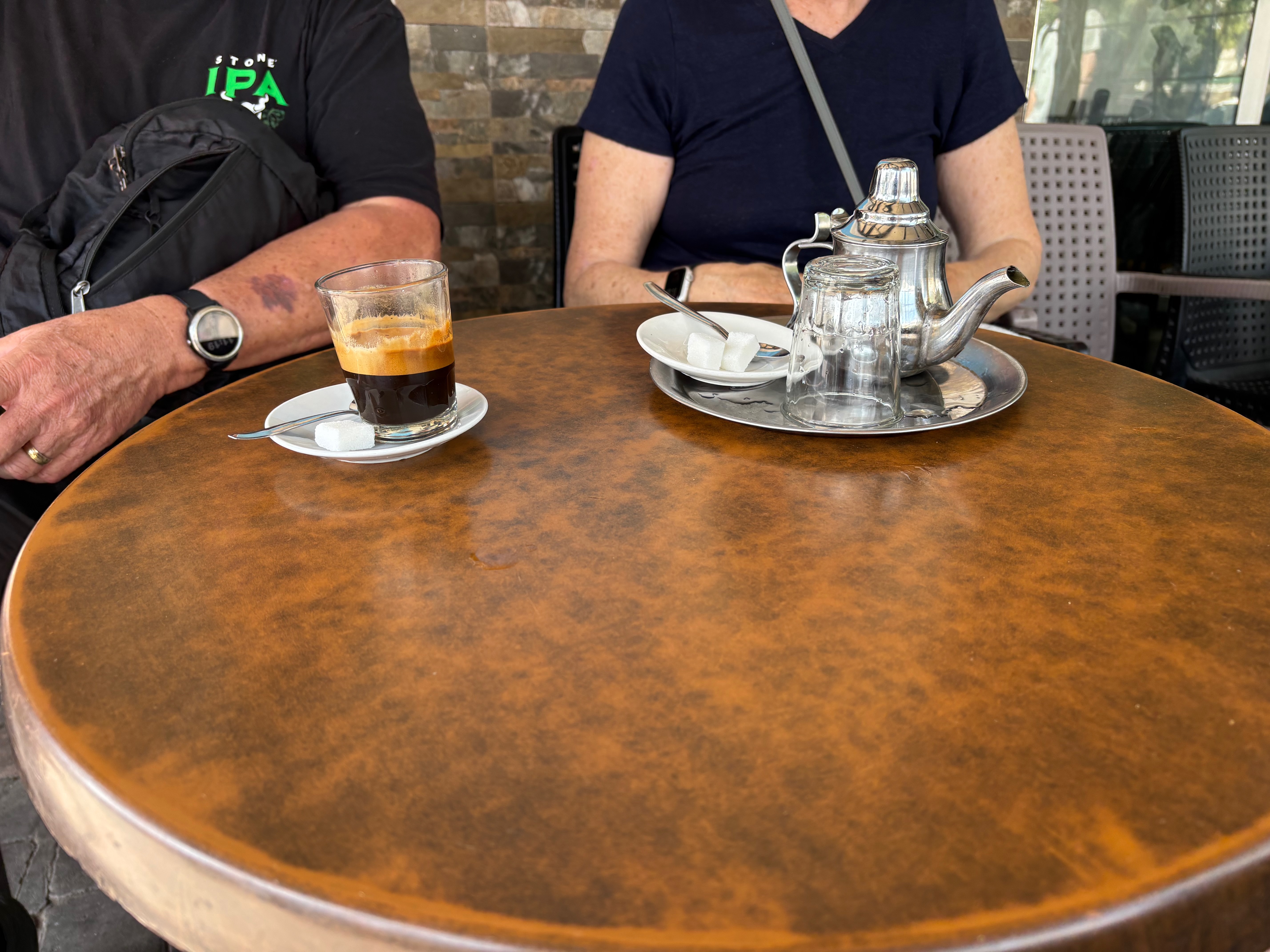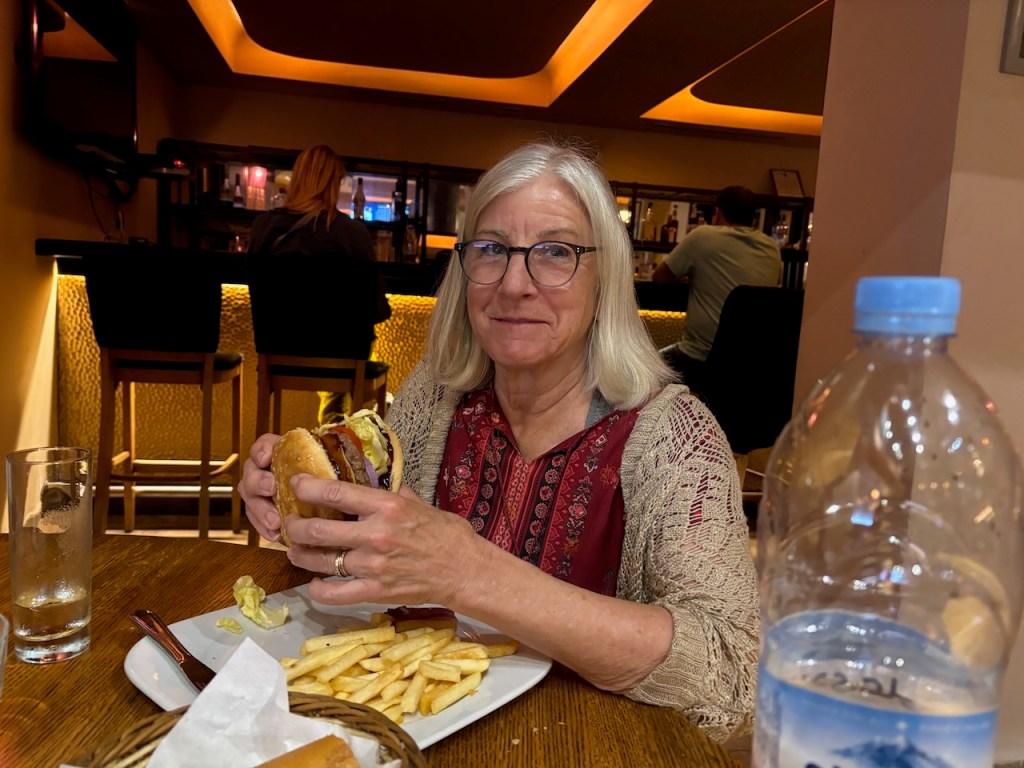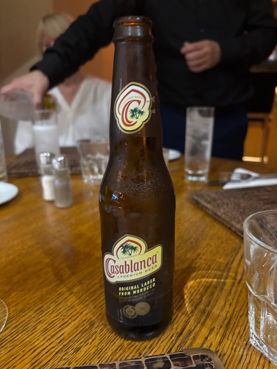 I started with a bowl of Moroccan soup, also known as Harira, which is made with tomatoes, lentils, chickpeas, warm aromatic spices, and often some type of meat. It was very good, and I would eat more of it during our journey. Next up was my Tagine with perfectly cooked chicken and some vegetables. Joanna’s burger was equally good, as was the salad that also came, our server thinking she wanted it when she asked for avocado. Needless to say, neither contained any avocado. The good news was that our total tab came to 490 Dirhams, or roughly 52 dollars, which included a second beer for me and that mistaken salad.