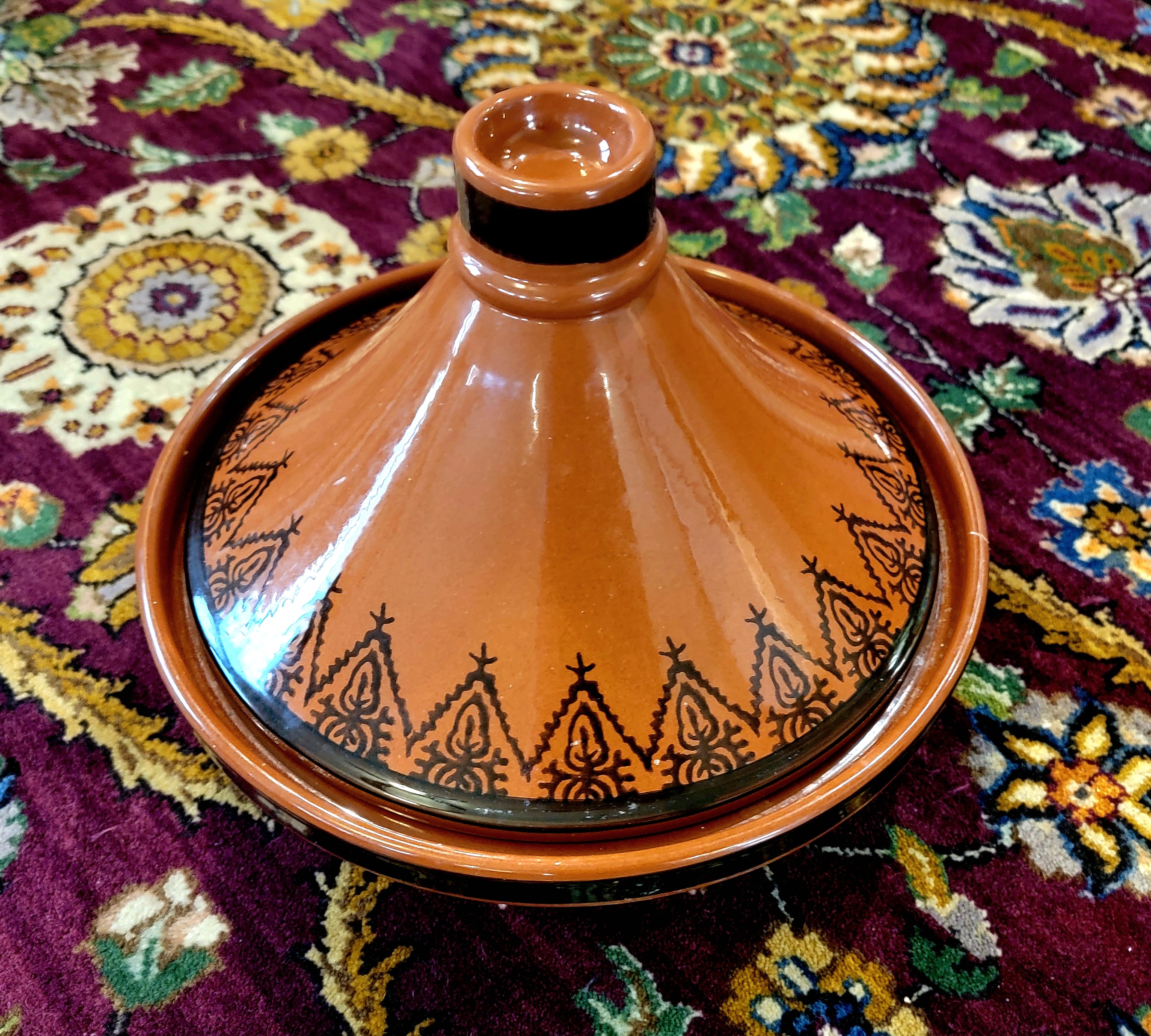 The traditional tagine pottery, sometimes painted or glazed, consists of two parts: a circular base unit that is flat with low sides and a large cone- or dome-shaped cover that sits on the base during cooking. The cover is designed to return all condensation to the bottom. That process can be improved by adding cold water into the specially designed well at the top of the lid.