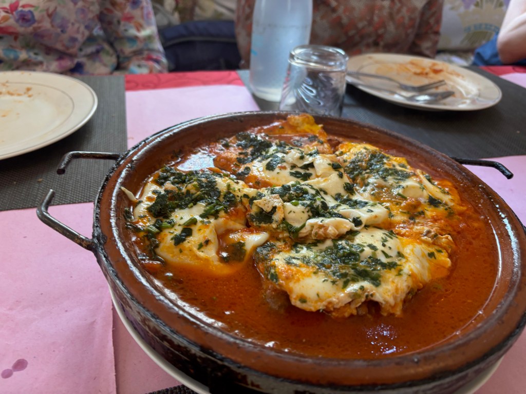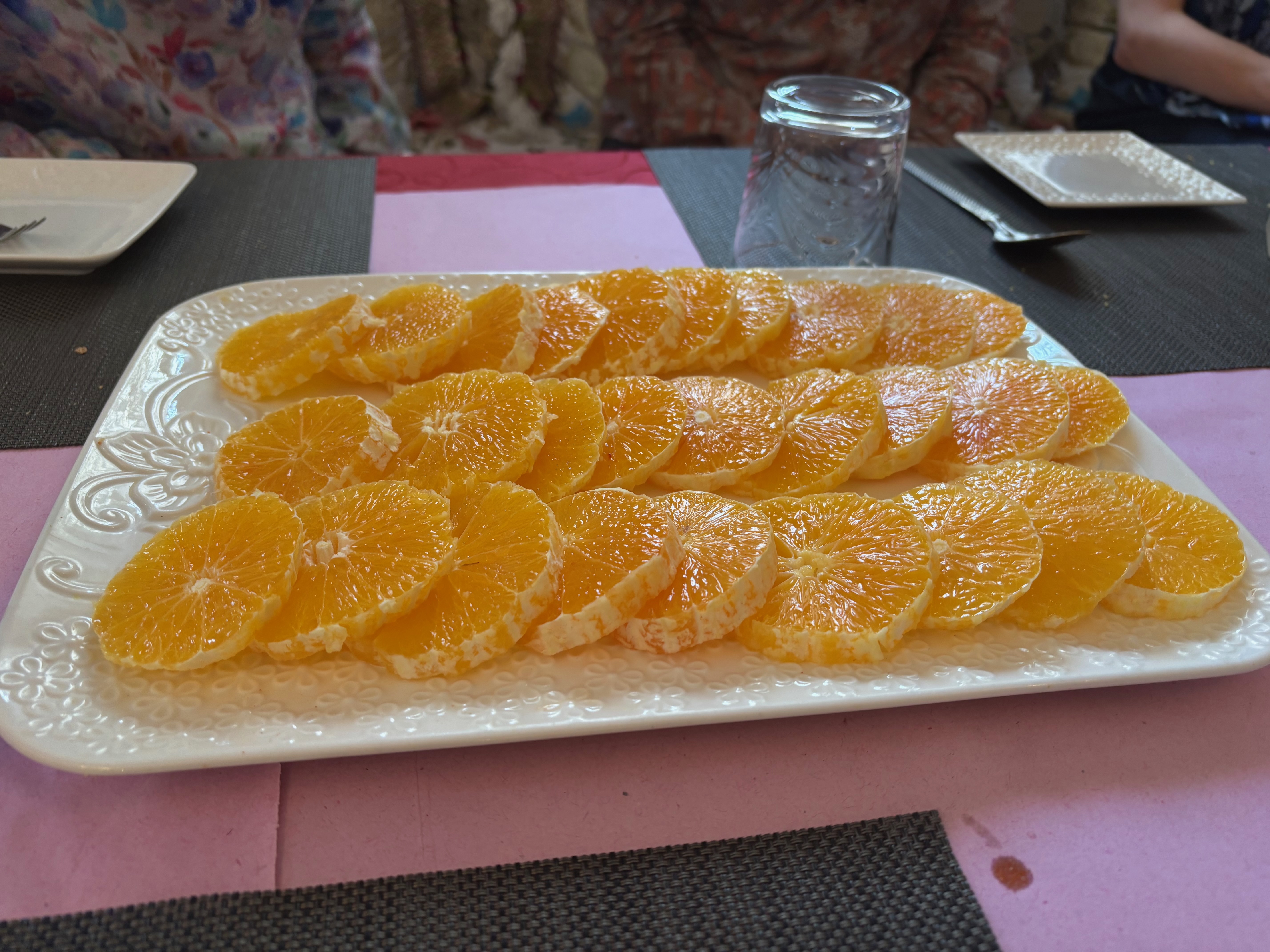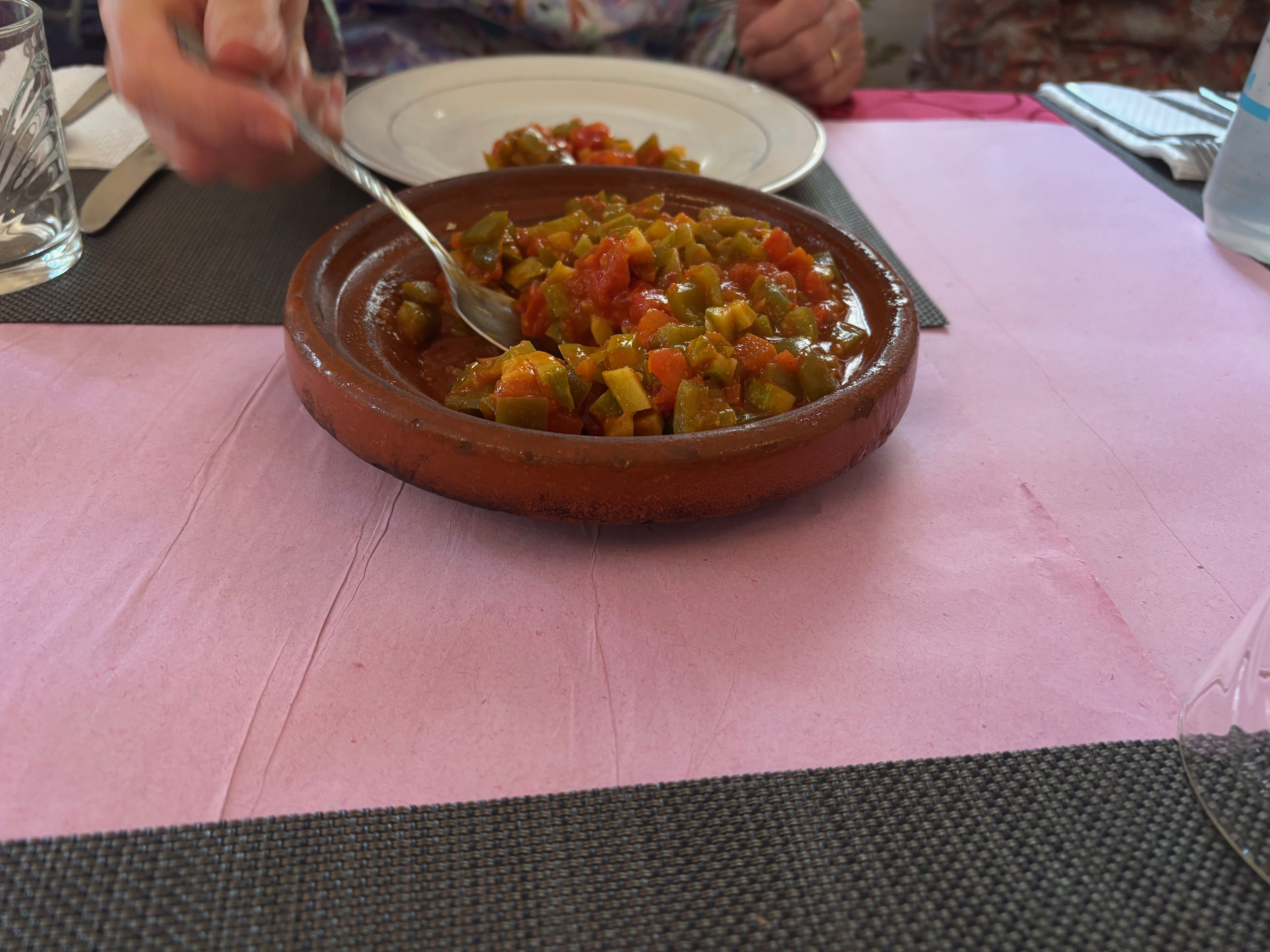 We were served an abundance of food, including a cold vegetable dish, meatballs in tomato sauce covered in cheese, chicken tagine, pita bread, and couscous. For dessert sliced oranges sprinkled with cinnamon (a surprise and delicious) and all the tea and water we could drink.