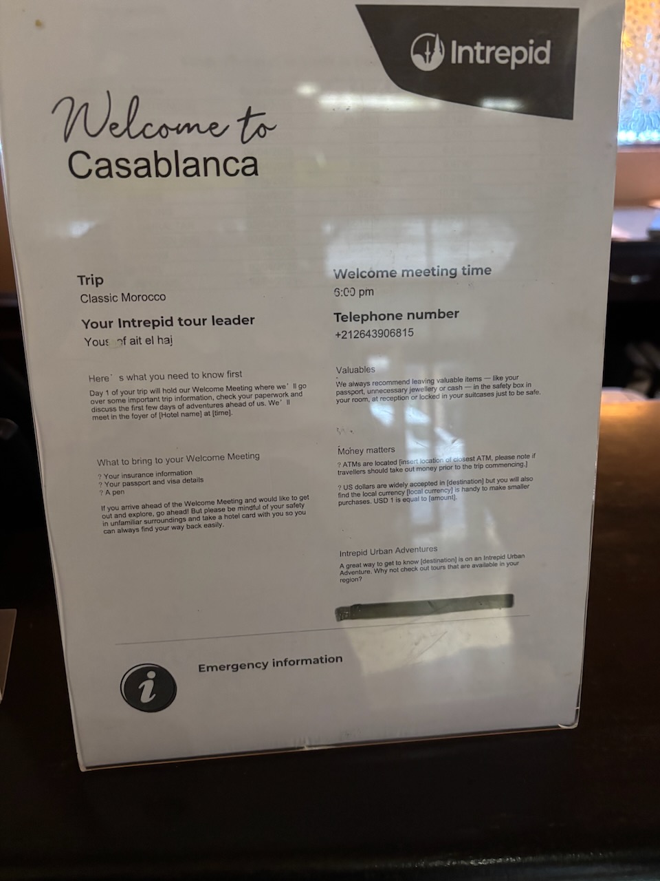 The tour would last seven nights with stops in Fes, a Sahra Desert campground, Todra Gorge, Ait Benhaddou, and finally Marrakech. We were supposed to get 7 breakfasts, 1 lunch, and 3 dinners (but would end up with one or two more) and including almost all excursions and transportation our cost would be $1,545 per person, quite reasonable when compared to what other tour companies may charge for a trip of this nature.