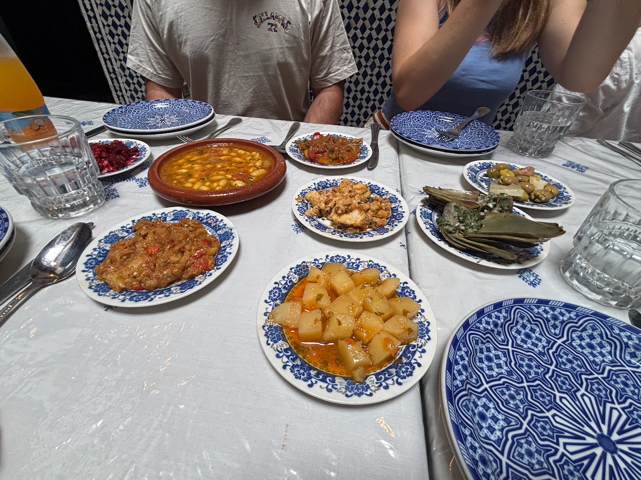 First off, we had a round of small dishes (cooked potatoes, cold vegetables, etc.) and then I had the pastilla, which is known for its unique blend of sweet and savory flavors. The traditional filling often features slow-cooked chicken or pigeon, spiced with ginger, saffron, and cinnamon, then combined with eggs, caramelized onions, and toasted almonds. It is baked in warqa dough (a very fine, crispy pastry, not too dissimilar to filo) to a golden, flaky texture, providing a delightful contrast to the rich and flavorful filling. It was tasty and curiously, it would be the last time we would run across in for the rest of the trip.