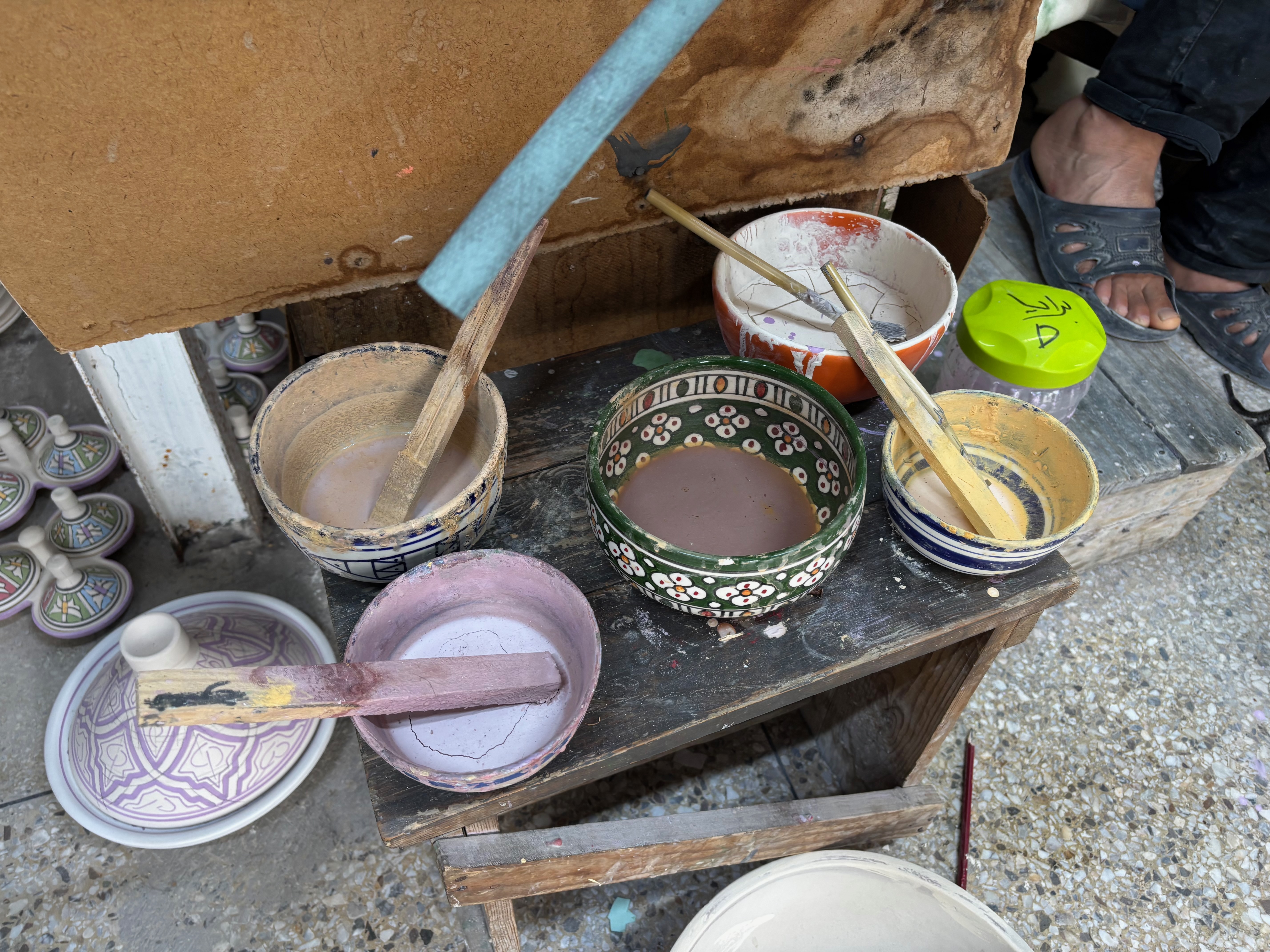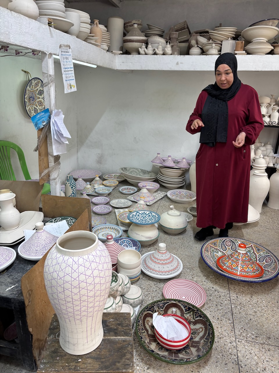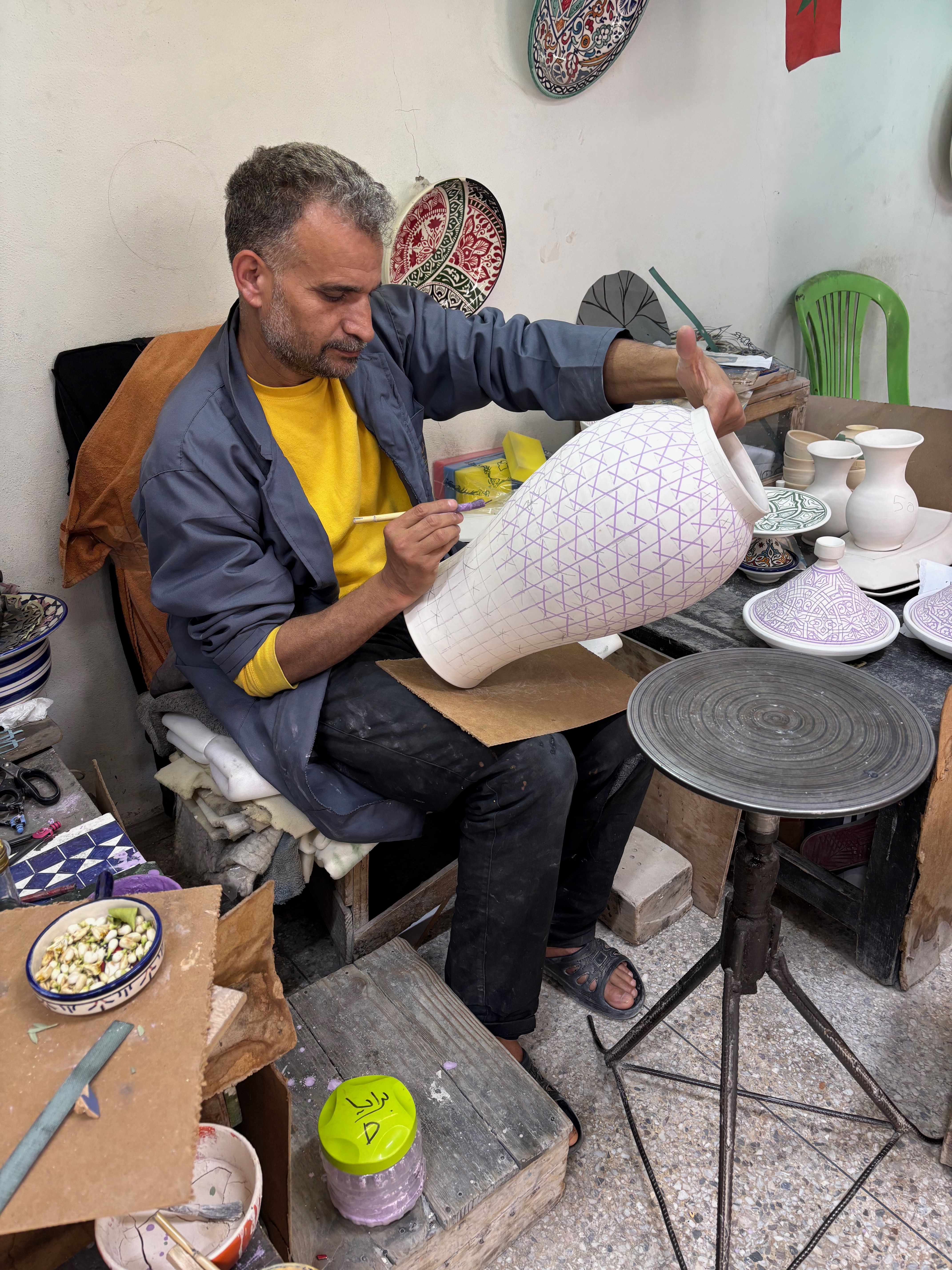 Our next stop was the pottery room, where we observed men and women in the process of either forming pots, urns, plates and tagine or engaged in decorating them. In particular one fellow was creating an intricate geometric pattern without the aid of a stencil, that is completely freehanded.