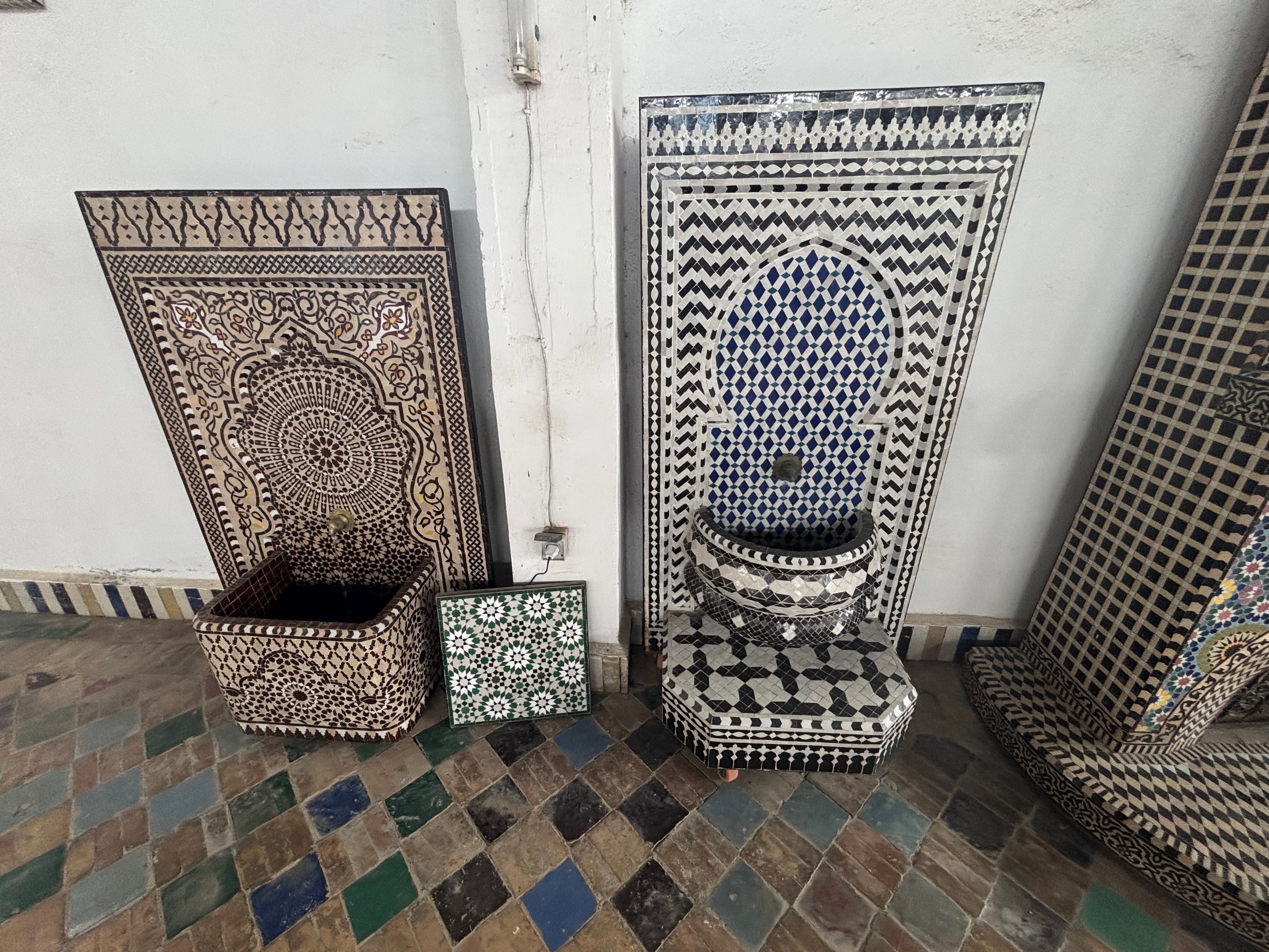 Until you walk through a medina of this size and scope, it is nearly impossible to convey the sights, sounds, smells and overall ambiance of the place. We would end up walking nearly five miles that day, the bulk of it in an endless maze of shops selling whatever product you can imagine, with hundreds of them pretty much selling the same thing. How any of them make money is beyond me. After wandering through aisle after aisle, we stopped in at the Al-Atttarine Madrassa (also known as the Ben Youssef Madrasa) built by the Marinid sultan Uthman II Abu Said in 1323-5. The madrasa takes its name from the Souk al-Attarine, the spice and perfume market. Functioning today as a historical site, the Madrasa was the largest Islamic college in the Maghreb at its height and is widely recognized as a pinnacle of Saadian and Moroccan architecture.