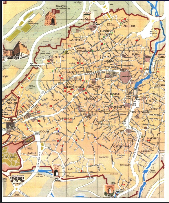 Back in the van, we drove a short distance and parked within walking distance of a square that led to the maze of streets that would be our home for the next few hours. The historic city of Fez consists of Fes el-Bali, the original city on both shores of the Oued Fes (River of Fez), and the smaller Fez Jdid, founded on higher ground to the west in the 13th century. It is distinct from Fez’s now much larger Ville Nouvelle (new city). Fes el-Bali is the oldest continuously inhabited walled city in the Arab world, and one of the largest and oldest urban pedestrian zones (car-free areas) in the whole world. These two historic cities are linked together and are usually referred to together as the “medina” of Fez, though this term is sometimes applied more restrictively to Fes el-Bali only. It is also the site of the famous Qarawiyyin University, founded as a mosque by Fatima al-Fihri in 857–859 and subsequently became one of the leading spiritual and educational centers of the Islamic Golden Age.