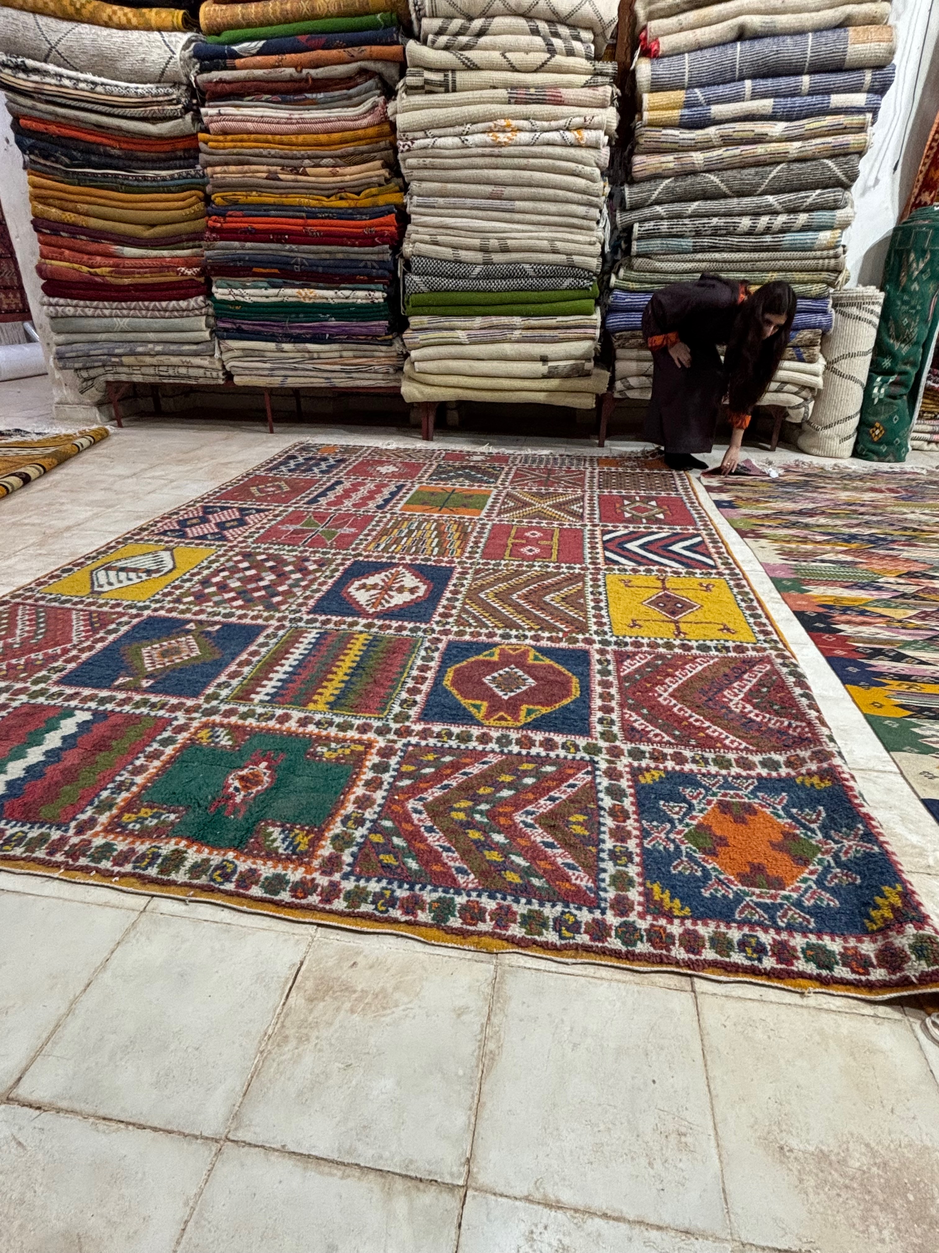 Finished with lunch we motored a short distance to Riad Ouinz, our lodging that night just across the Ounila River from the fortified village of Alt Benhaddou. We checked into our very nice room (ours was next to an outdoor pool (much too cold to be swimming in though) where we dropped our luggage and then back in the van for a short drive to a grouping of houses where we entered a Carpet Weaving Cooperative. Here we watched some weaving in process, were informed about the nature of this woman owned business, examined room after room full of inventory of all sizes and finally bought our own small rug to be mailed home.