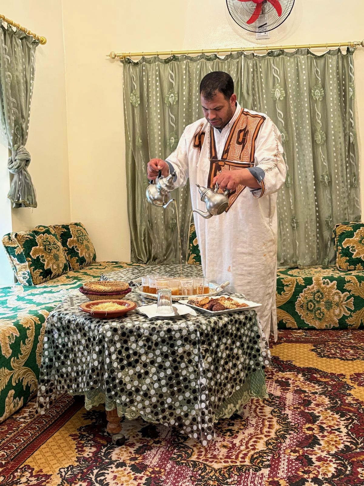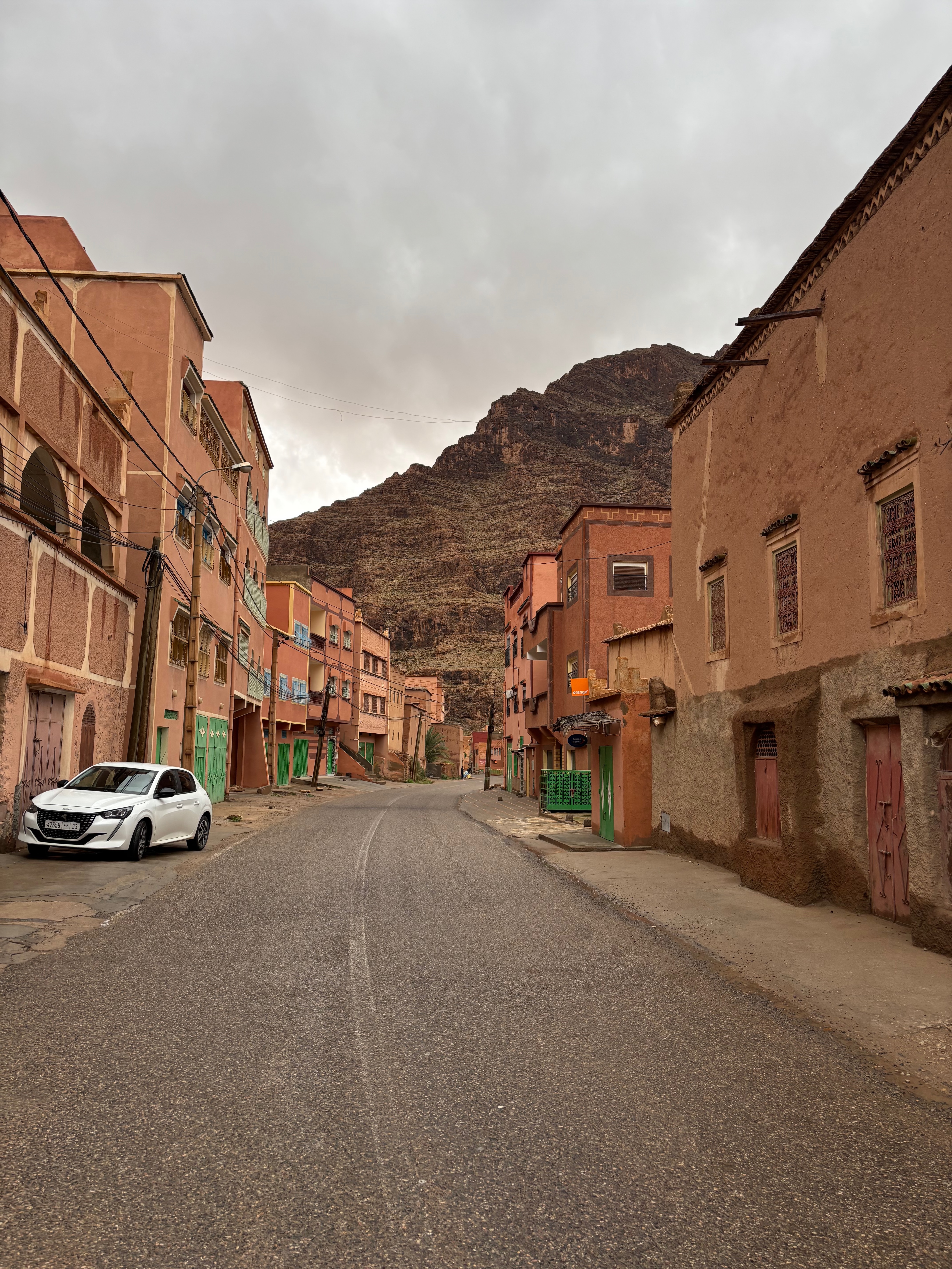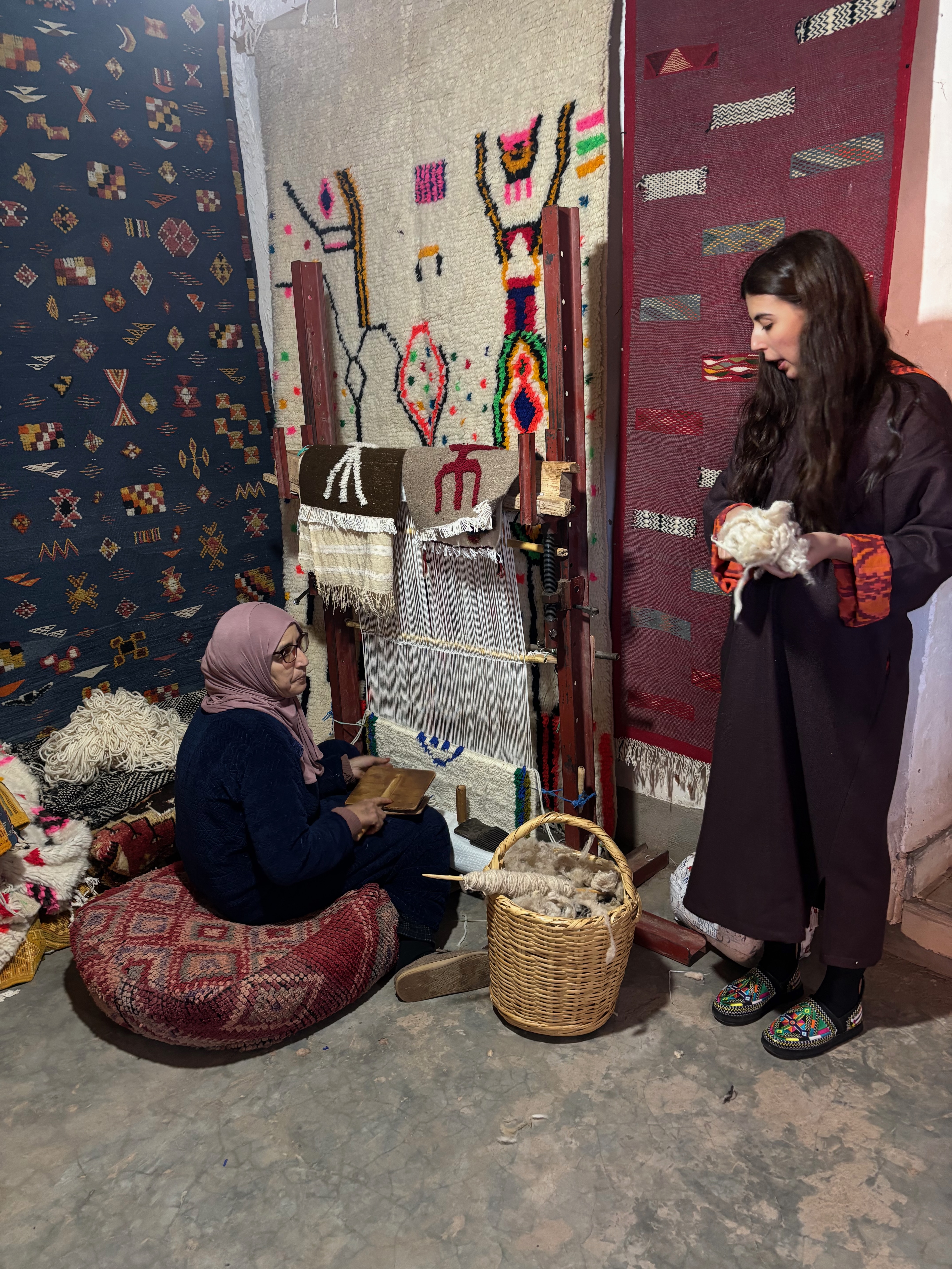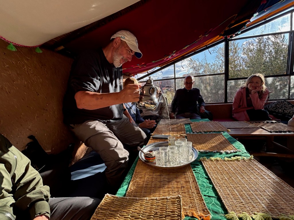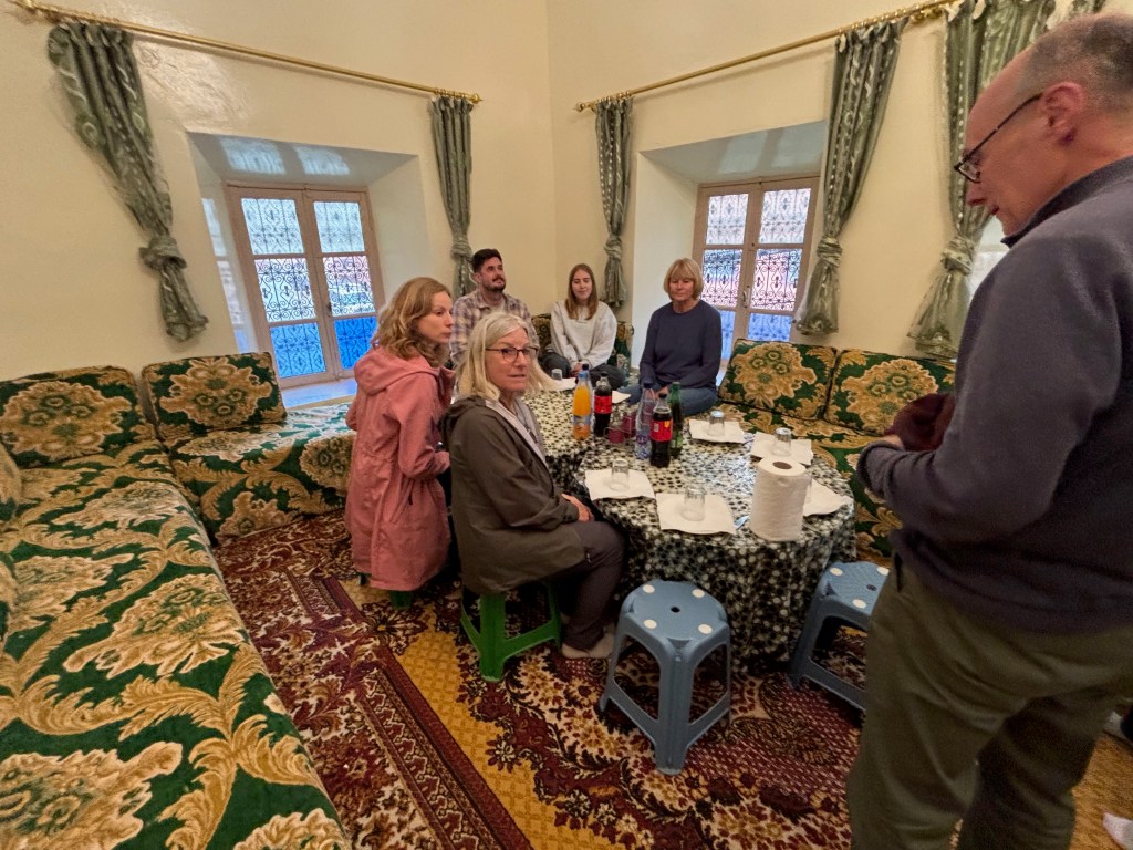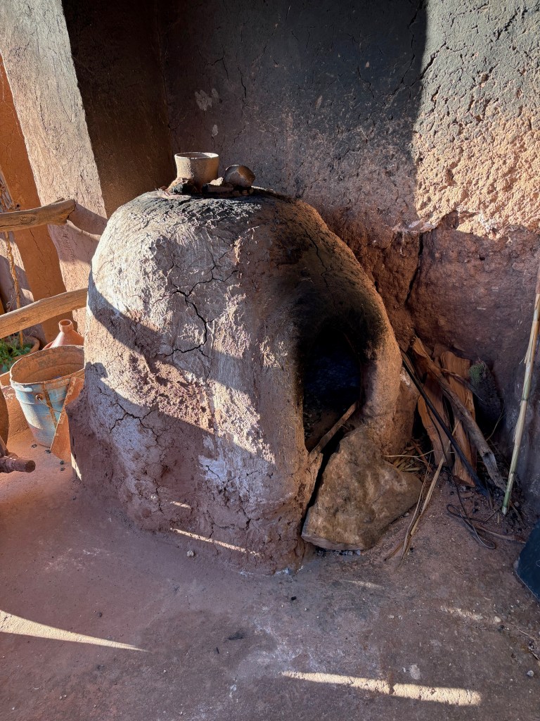 We climbed steadily through the narrow lanes, crowded with shops until we reached a viewing spot that led to steep stairs to a summit at the top of the town. I chose to stay there while others in the group made the climb, returning to exclaim how incredibly windy it was up there. On the way back down we stopped at the Tawesna Teahouse, a community-run establishment that provides local women an income to support themselves and their children. Using ingredients sourced from local cooperatives, the women prepare mint tea and pastries, each of which we enjoyed during our stop.