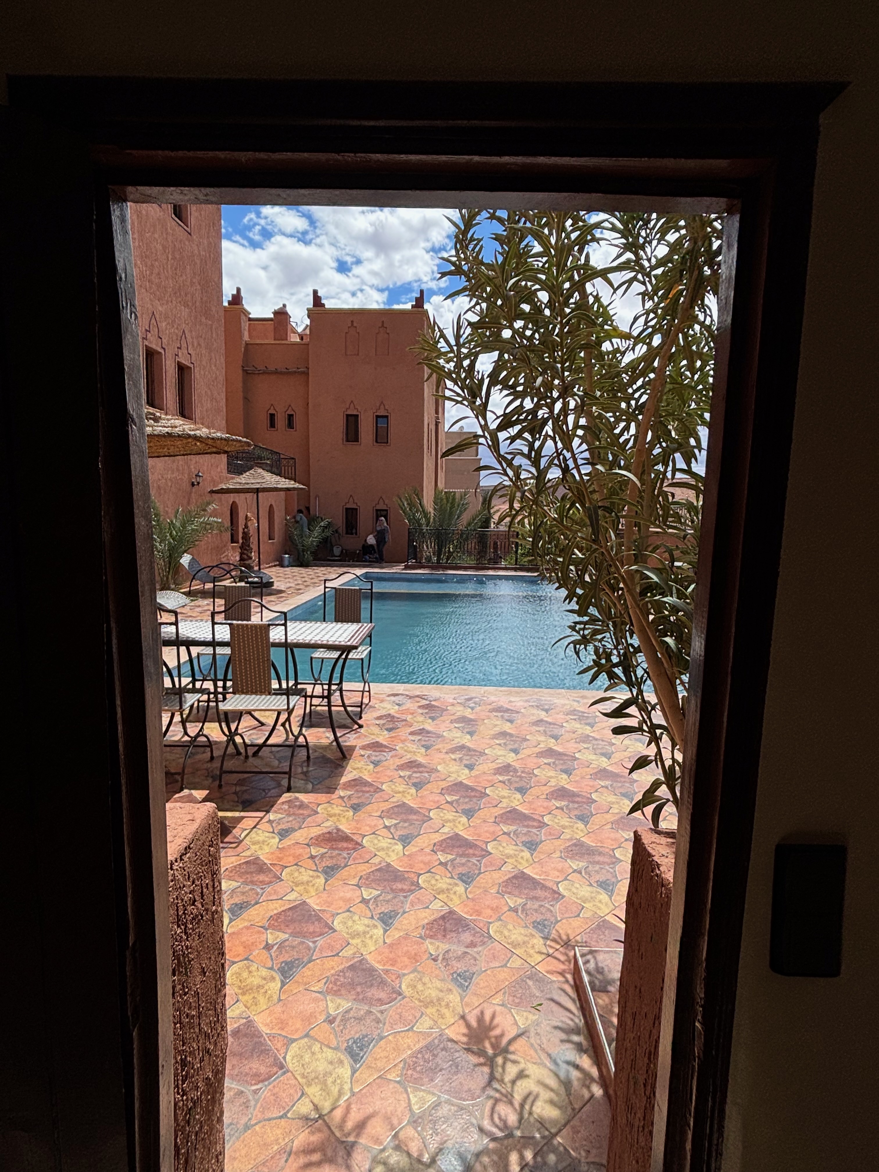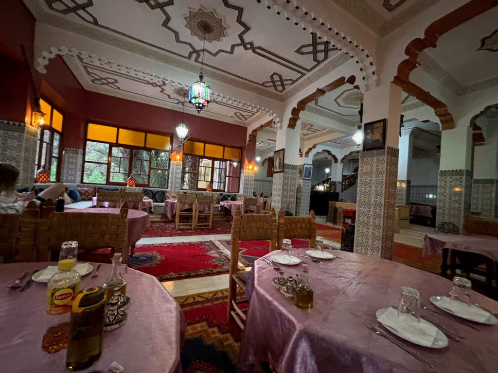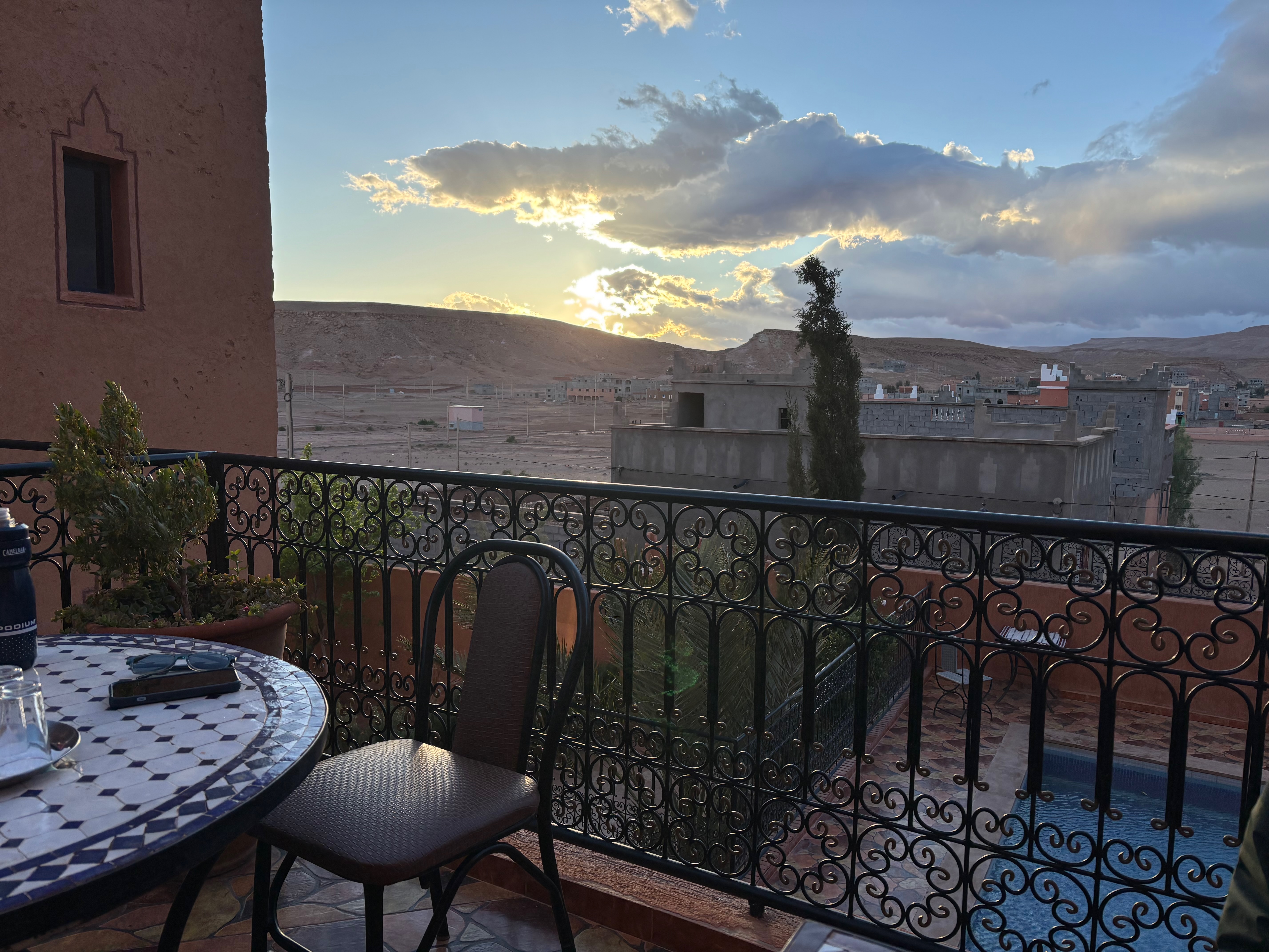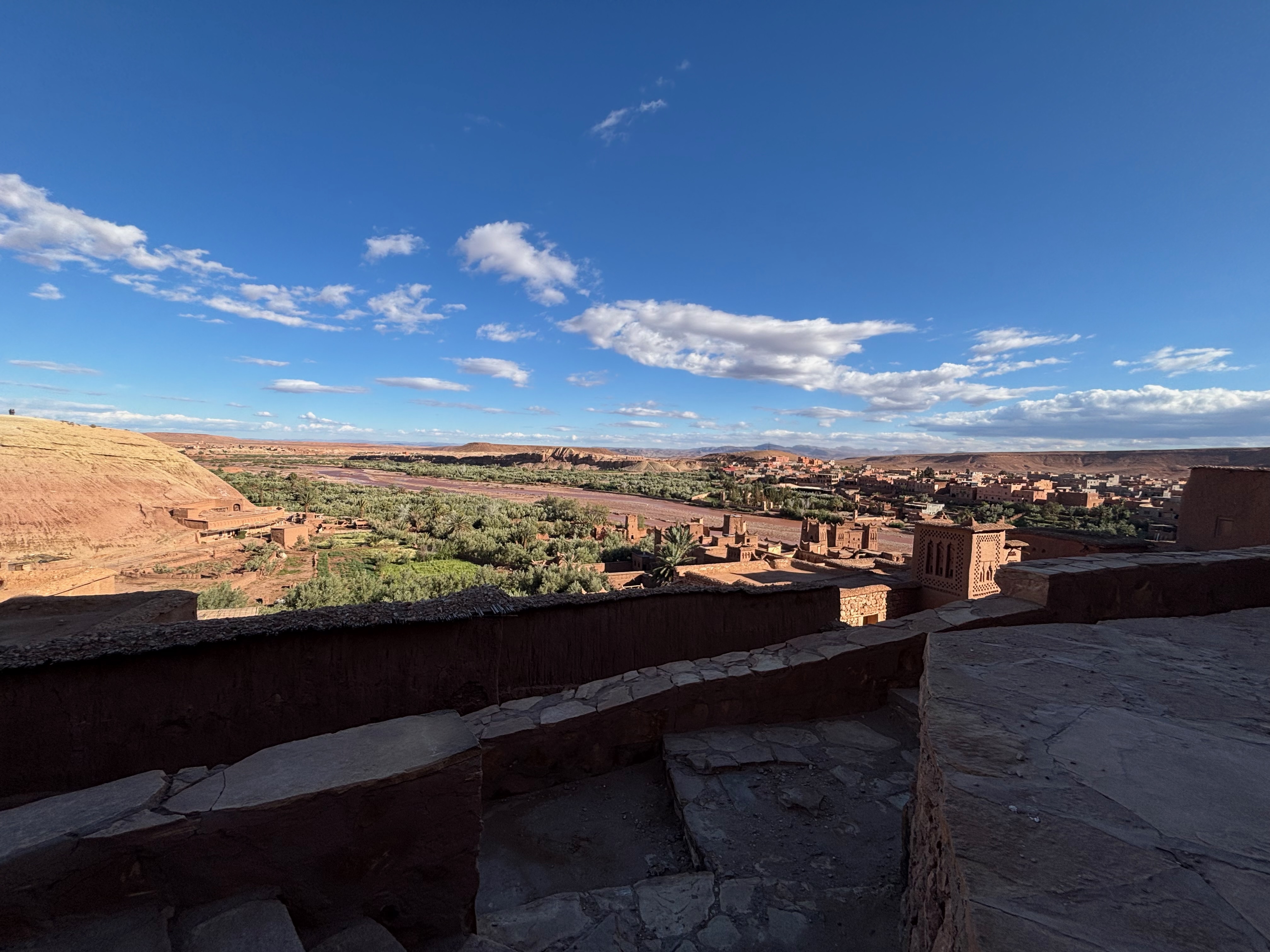 Partway there, we pulled over at an overlook to see the valley and town of Souk Lakhmis Dades, a commune in the Tinghir Province where we got a look at the snowcapped Atlas Mountains in the background. Later, we stopped for lunch in Ouarzazate, nicknamed the door of the desert, which is the capital of Ouarzazate Province in the region of Drâa-Tafila at La Terrasse. The town is a primary tourist destination in Morocco during the holidays, as well as a starting point for excursions into and across the Draa Valley and the desert.