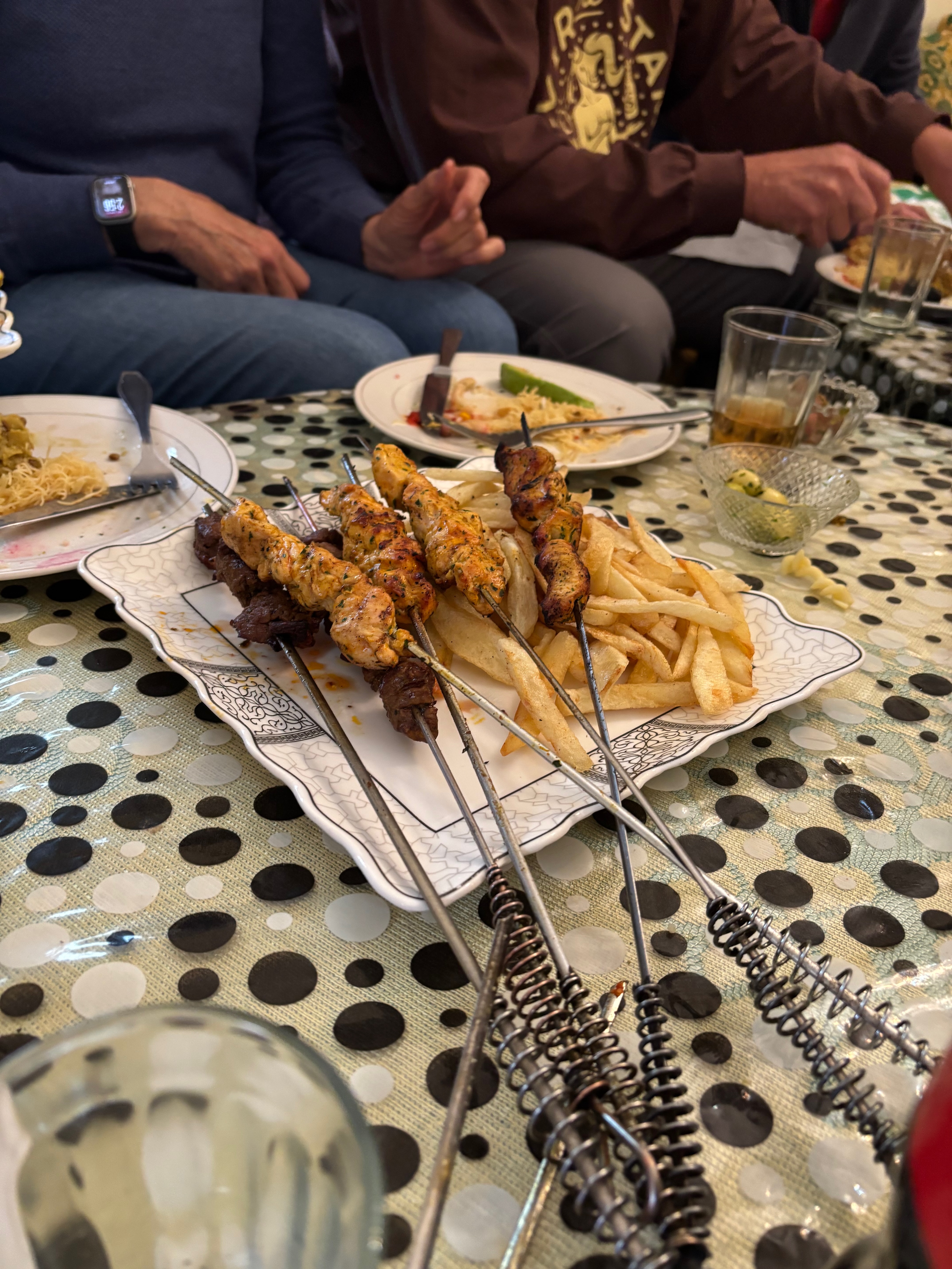 Our in-home lunch would again be a treat, with plenty of delicious food, this time including pita bread, cold vegetables, roasted chicken, warm noodles and kebabs, both chicken and beef. Washed down with tea, and a variety of sodas, it was more than enough to keep me full until the next day. One ritual you encounter at these meals is the pouring of tea, where the server holds the teapot low above the glass and then raises the pot with the stream of liquid pouring out in an arc, without a splash or any lost liquid.