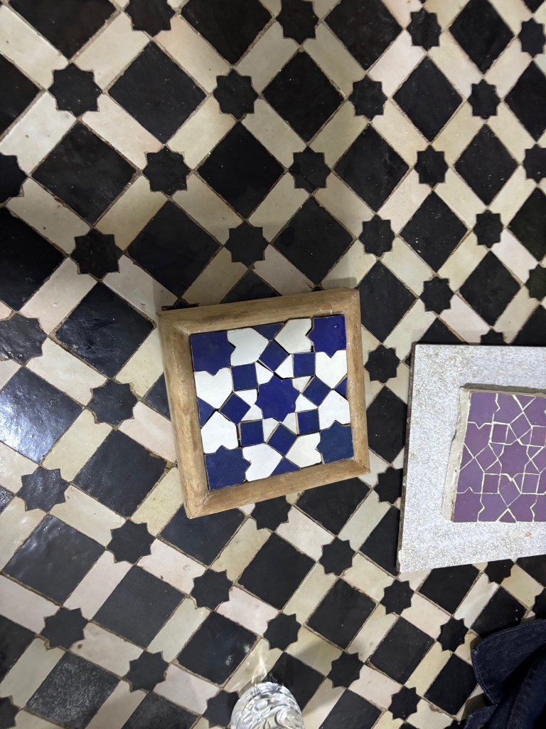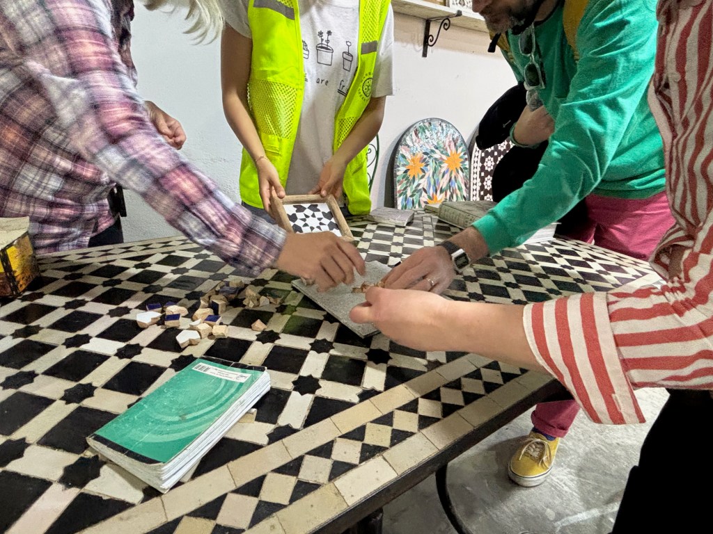 We stopped midway in a small plaza near the Almoravid Koubba, to view some Roman ruins below grade. Like so many other locations like this one, history often gets paved over, former city landmarks buried beneath the progress of following generations. We then entered a shop where some of us participated in piecing together a small version of a tile tabletop, like we had witnessed back in Fes.