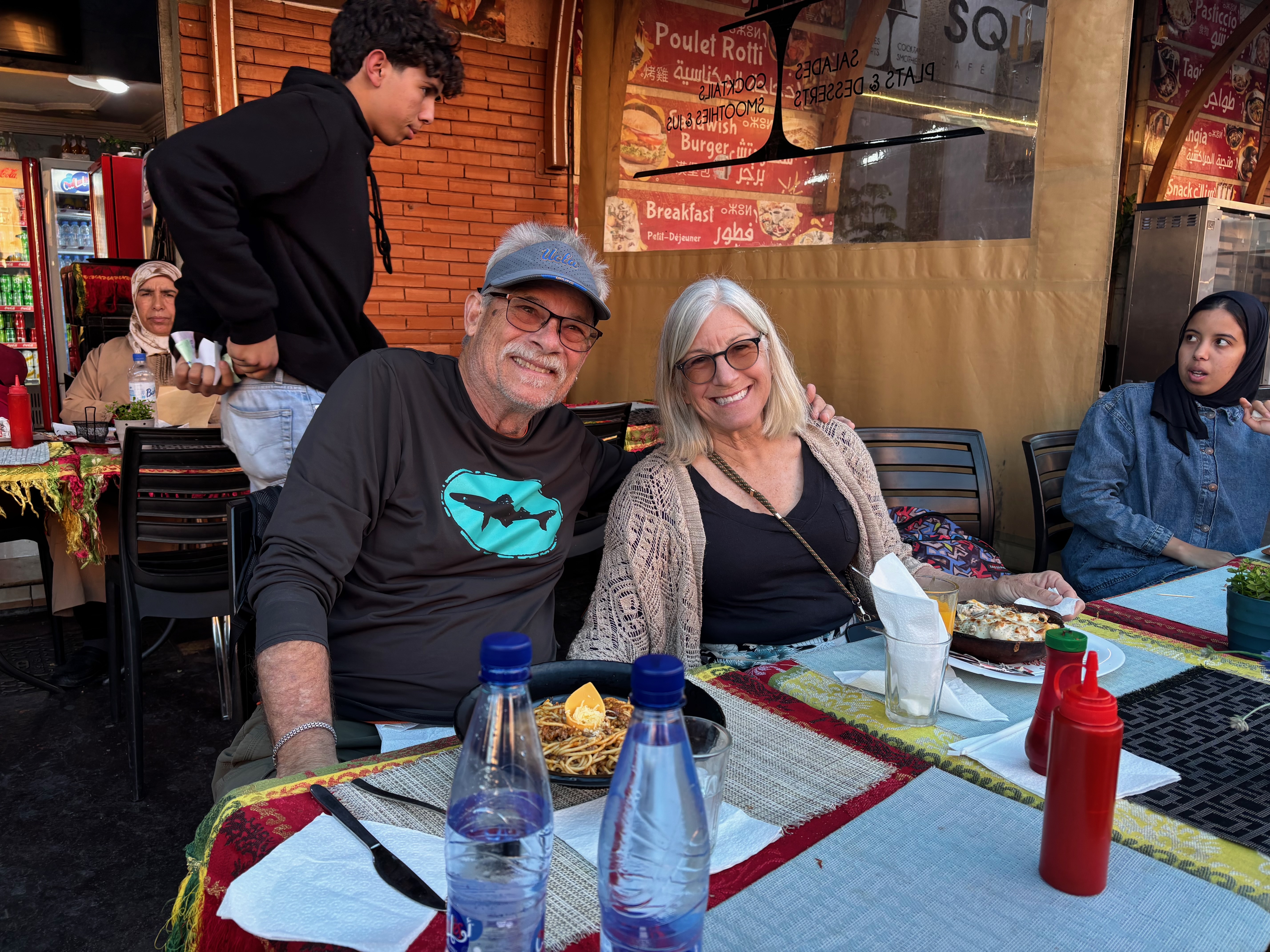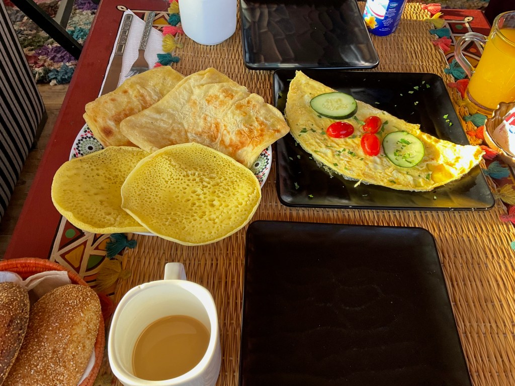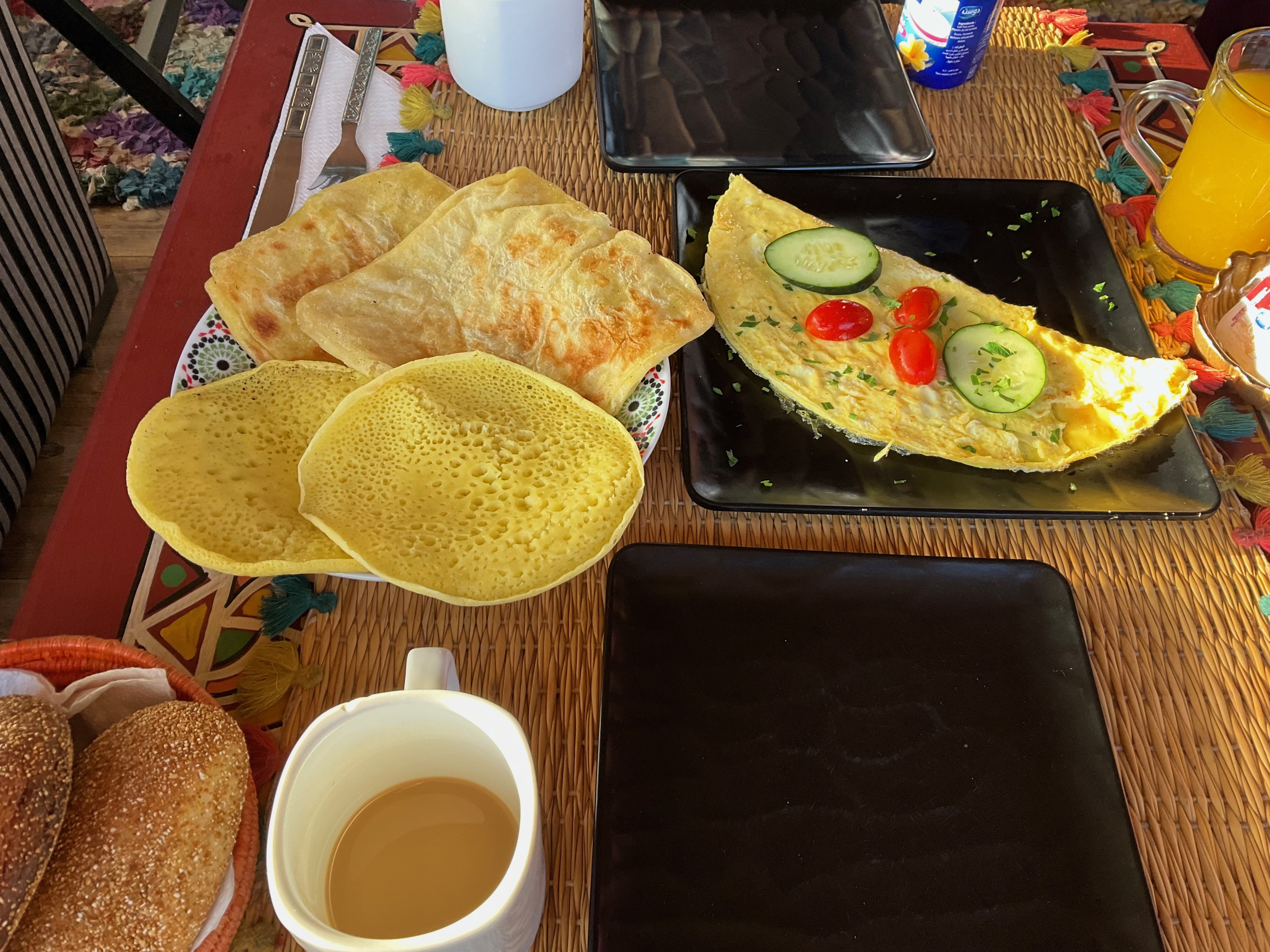 We disembarked and were shuttled back to the welcome center for a simple breakfast and then returned to the plaza for the walk to Riad Luzia. Later in the morning, we stepped out to explore the neighborhood and do some souvenir shopping. We stopped at a place I can’t remember for some lunch, an open-faced omelet of some sort for me and a Nutella crepe for Joanna. I have no record of this stop in my listing of expenses and no real description, only the pictures to remind us of the meal.