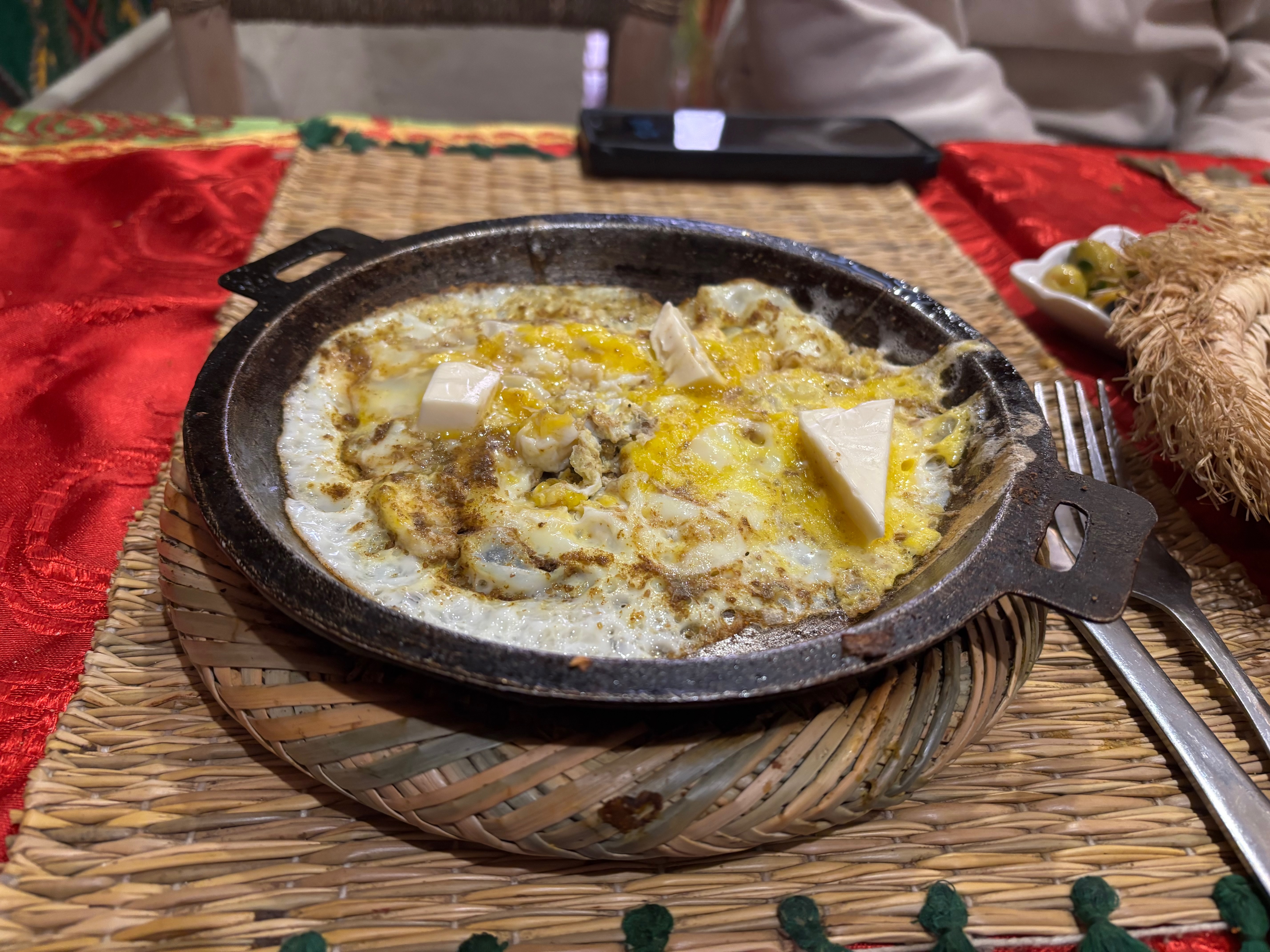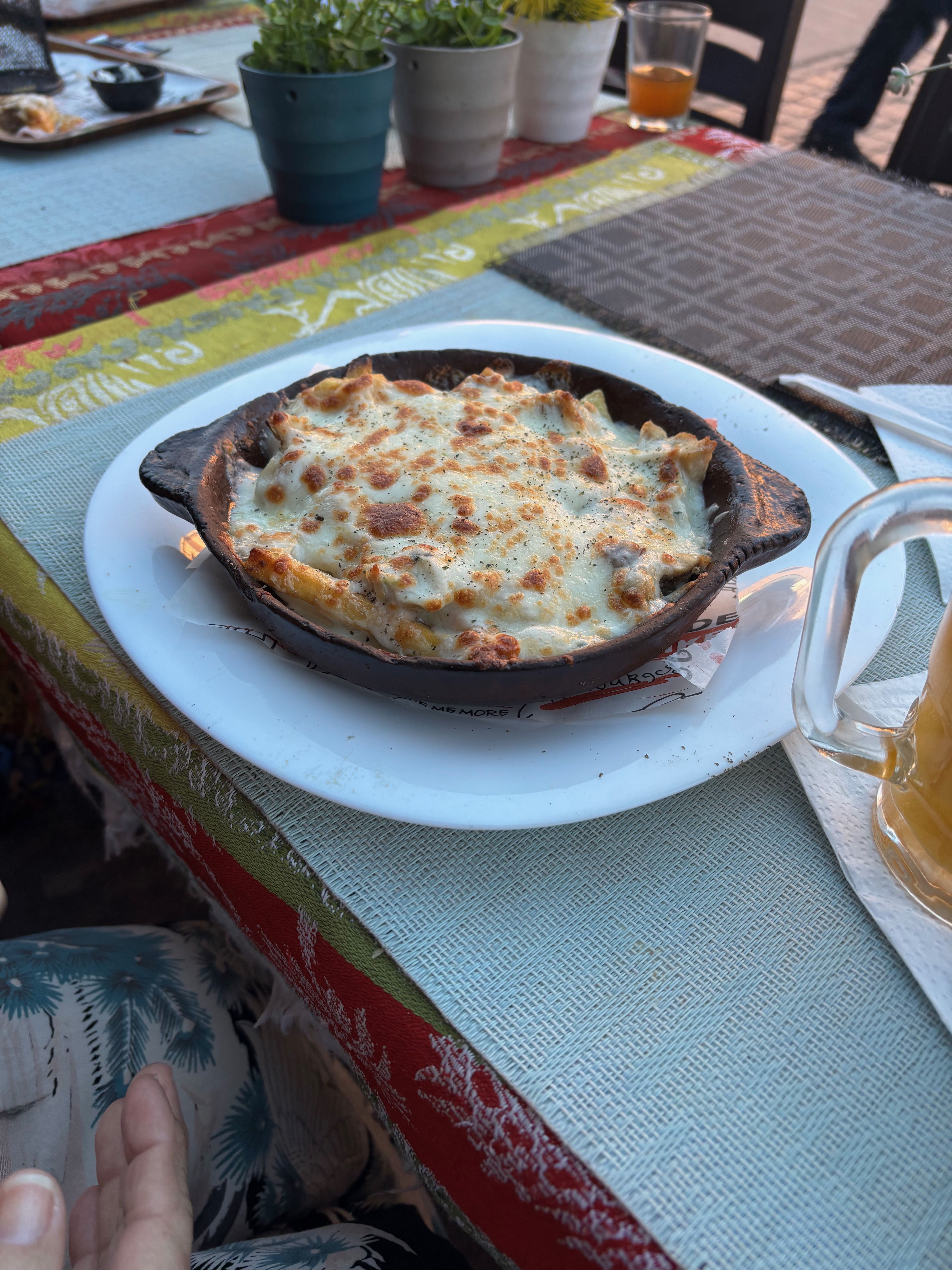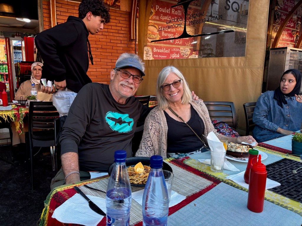 We disembarked and were shuttled back to the welcome center for a simple breakfast and then returned to the plaza for the walk to Riad Luzia. Later in the morning, we stepped out to explore the neighborhood and do some souvenir shopping. We stopped at a place I can’t remember for some lunch, an open-faced omelet of some sort for me and a Nutella crepe for Joanna. I have no record of this stop in my listing of expenses and no real description, only the pictures to remind us of the meal.