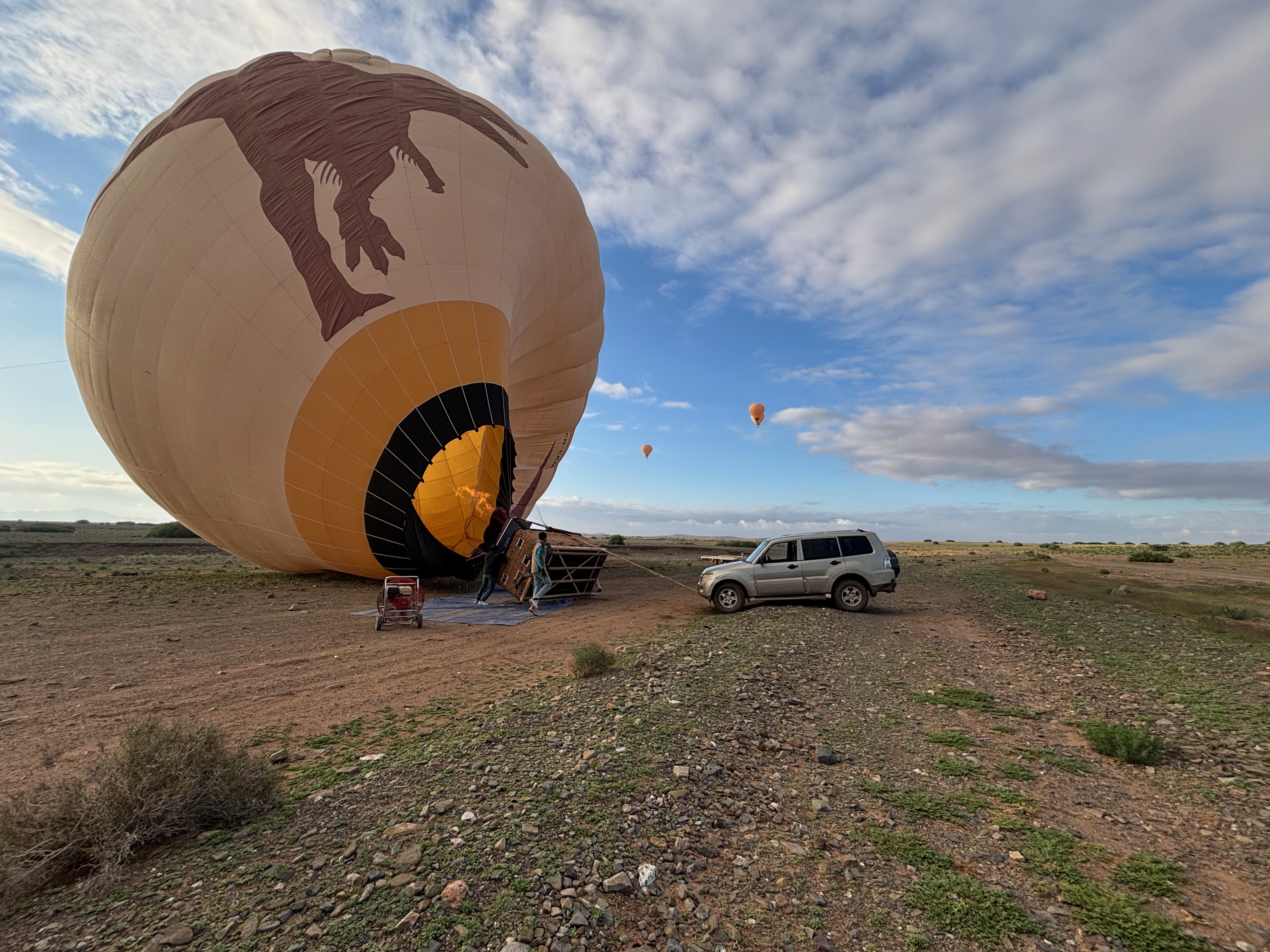 When we arrived, there were already a number of other outfits engaged in inflating their balloons, which is interesting to watch. The balloon is laid out horizontally on the ground and a large burner and fan are positioned at the mouth and turned on, using hot air to gradually inflate, which takes some amount of time, let’s say five to ten minutes. In our case just before the balloon reached full capacity, they had tied it off to the front of one of the pick-up trucks to keep it from floating away.