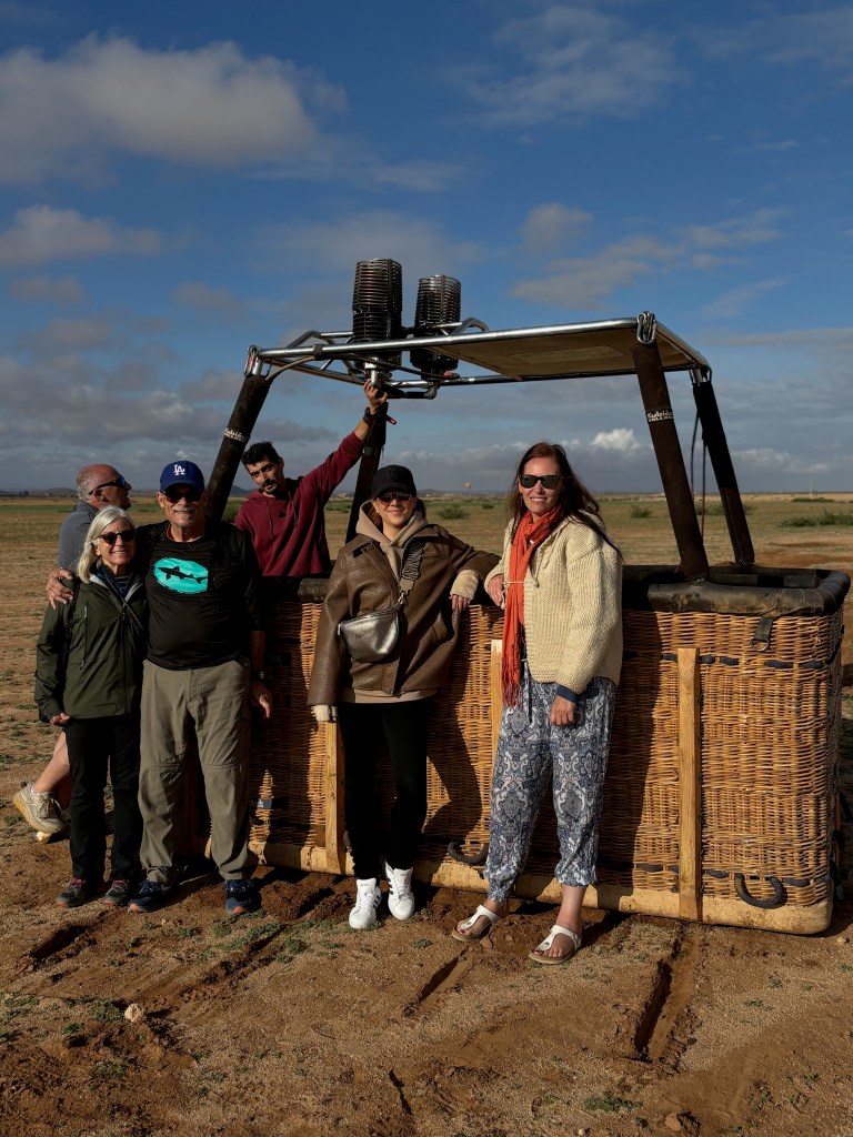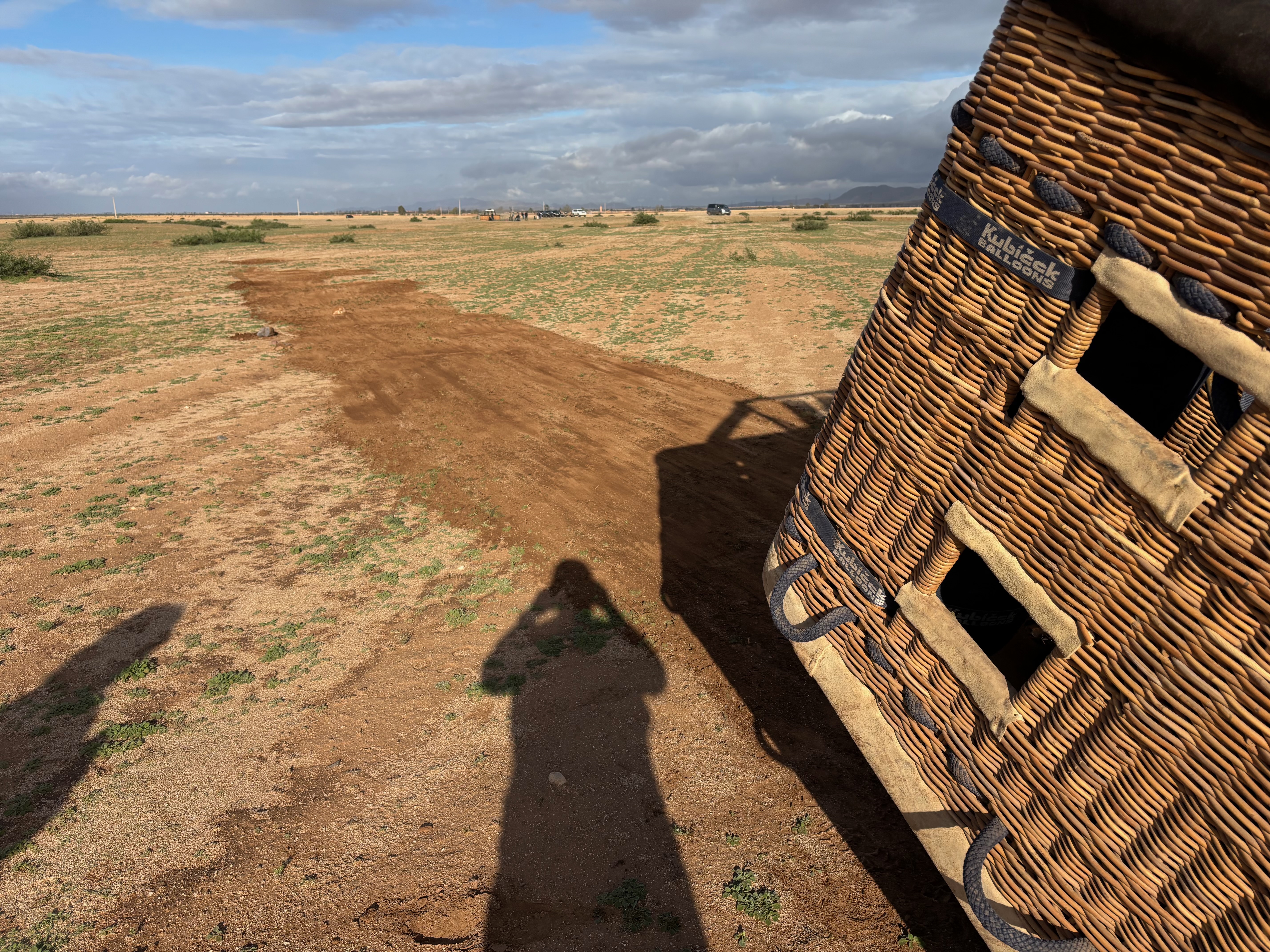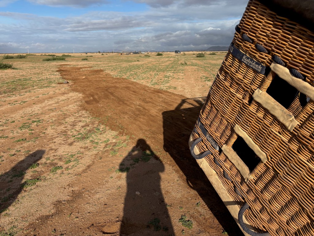 While aloft, we moved slowly in the mild winds, drifting over the landscape below, allowing us to peek into the lives of farm owners and suburban dwellers, wondering which road led to which house, remarking as to how many of them were large walled compounds. After a half hour or so (I truly lost track of the time) we came to our arrival zone, proceeded to descend and prepared for what would be a bumpy landing as the pilot maneuvers the balloon so that one edge of the gondola hits first, tipping us onto our backs and finally touching down.