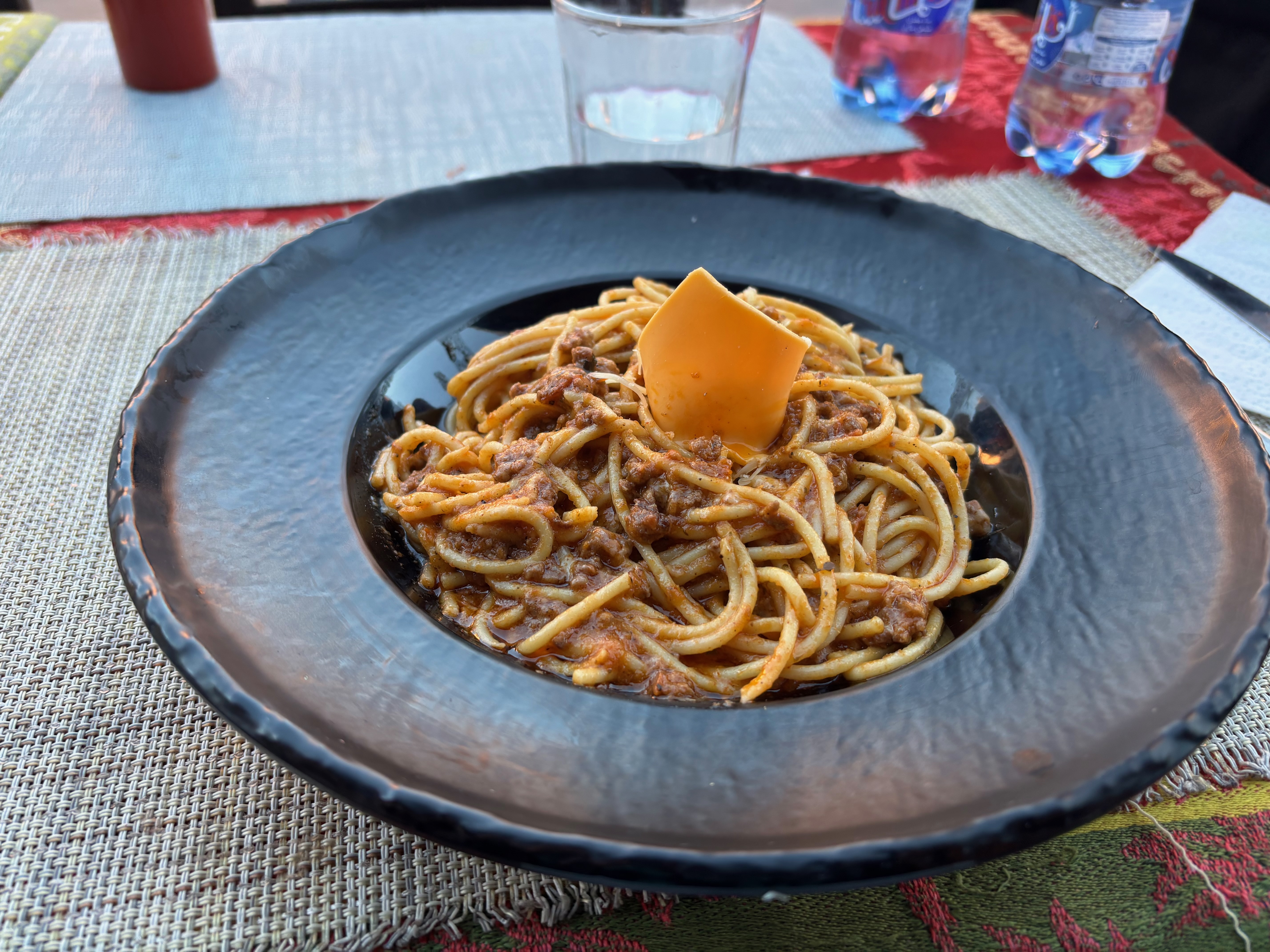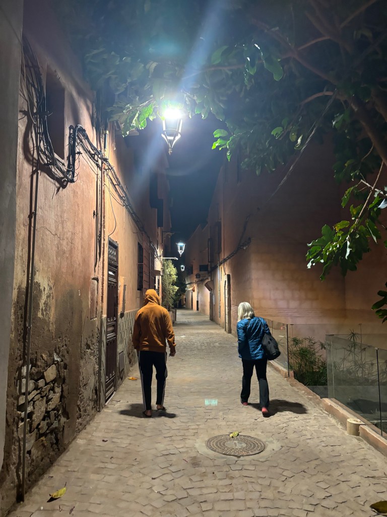 We worked our way back to Riad Luzia for a restful afternoon before heading out in the early evening in search of a store where we could purchase a bottle of wine, which proved fruitless and so we stopped just outside the Square of Djemaa el-Fna for dinner at one of the many small competing restaurants in that area, Time Food. We were seated at an outside table facing the busy pedestrian street and would enjoy, a mango juice and Pasticcio Poulet (baked pasta with chicken and melted cheese on top) for Joanna and a sparkling water and Pasta Bolognese for me. Both dishes were very nice and with a tab of just 110 Dirham ($12.50) including a small tip, we couldn’t be any happier.
