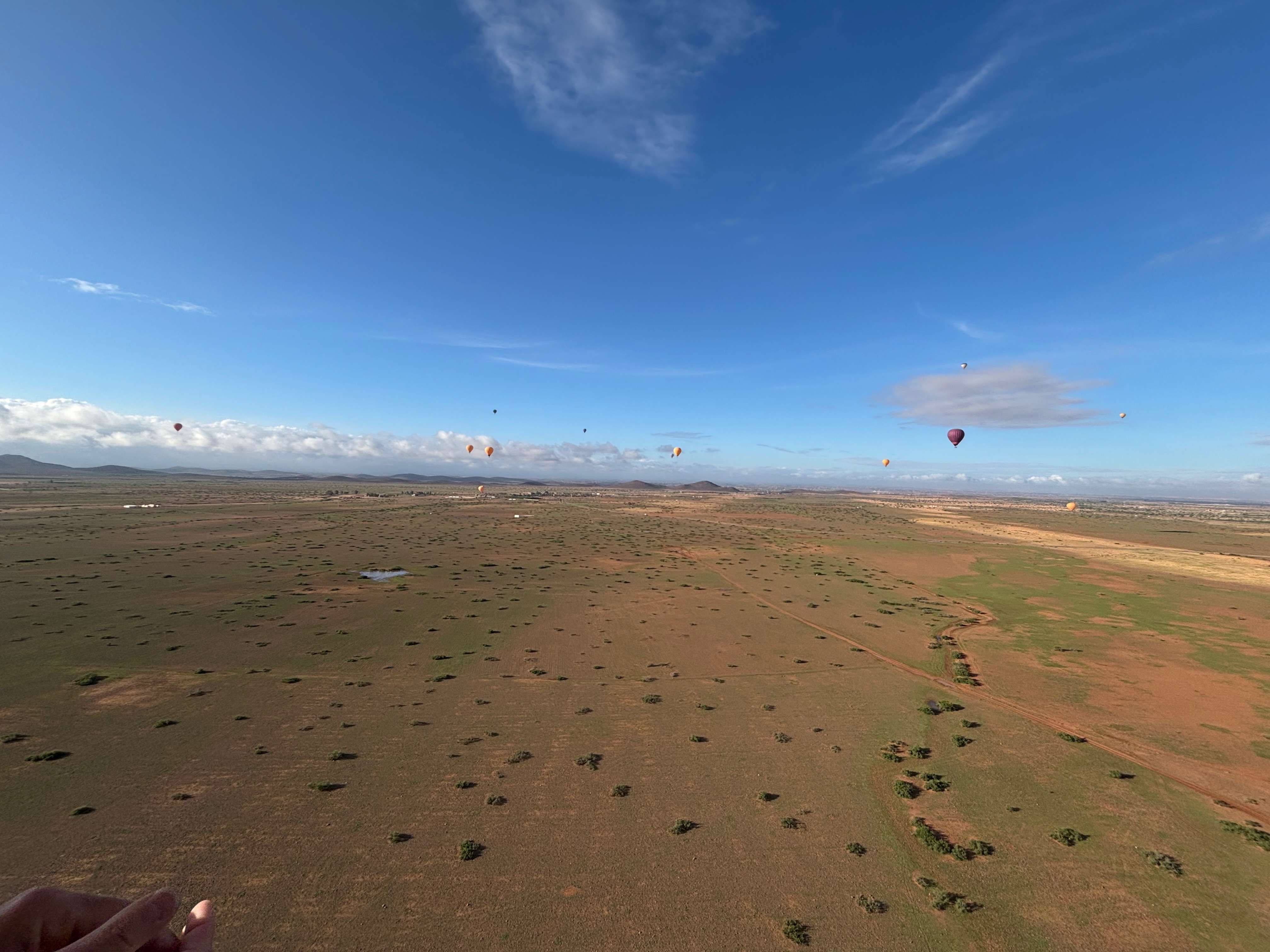 We then climbed, not too gracefully I might add, into the gondola and were shortly airborne, a silent ascent that seems effortless except for the loud whooshing sound the heater jet makes each time the pilot injects more hot air into the balloon. We didn’t ascend as high as some of the other balloons, but the distance didn’t seem to matter much as we viewed dozens of them against a backdrop of clear blue skies and the mountains we’d come from recently.