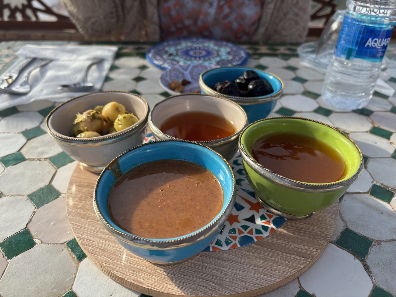 It having been a long day of travel, we walked out of the medina in search of food and eventually settled on the busy and inexpensive Pizza Ricca, where we enjoyed three slices of very good pizza, a bottle of water and a diet coke for 54 Dirhams ($6.12). We walked back to the Riad checking out the shops that lined the street thinking of potential souvenirs but waiting until later to choose something.
