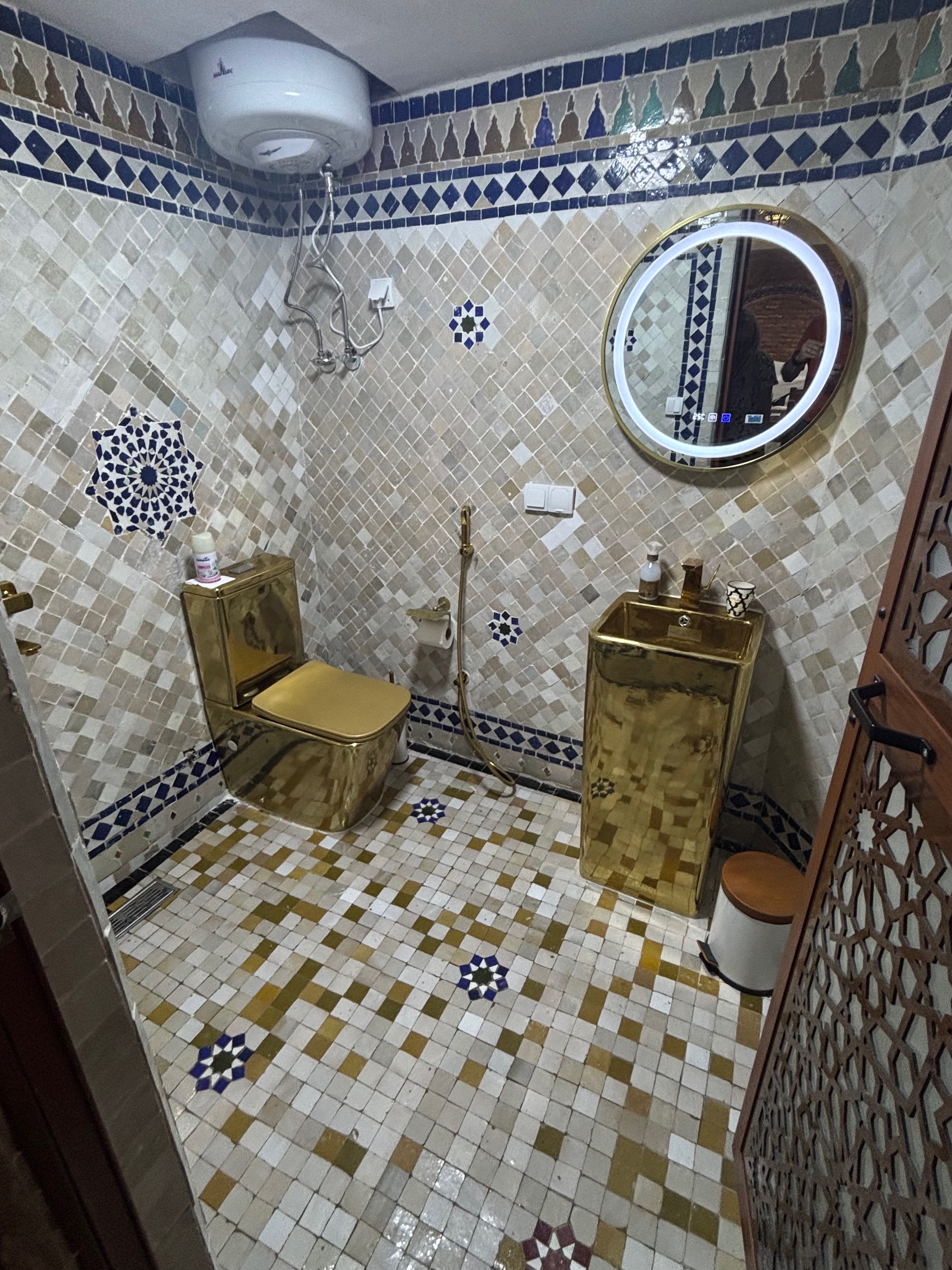 We found it to be a typical Riad in terms of interior design and decoration, providing for a relaxing atmosphere. Our room though, while adequate, was quite narrow leaving little or no room between the sides of the bed and the walls of the room. Our bathroom was spacious, but it was of one piece, that is, that shower, toilet and sink all shared the same space. Nicely tiled it was furnished with replica gold plating on the fixtures, an odd choice for a hotel room. We were more than pleased though with the price at 1,450 Dirhams ($164) for our two-night stay.