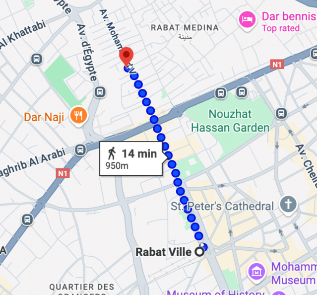For not much more money, we’d booked first class tickets at 570 Dirhams ($63) for the two of us and were glad to have done so, as our compartment of six seats was full throughout our journey. The trip went smoothly, and we arrived in Rabat with a 15-minute walk up Avenue Mohammed V to the medina and our stay at Riad Asswar, a relatively new accommodation that went out of their way to curry favor with us so that we would give them a good rating.