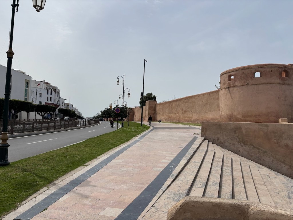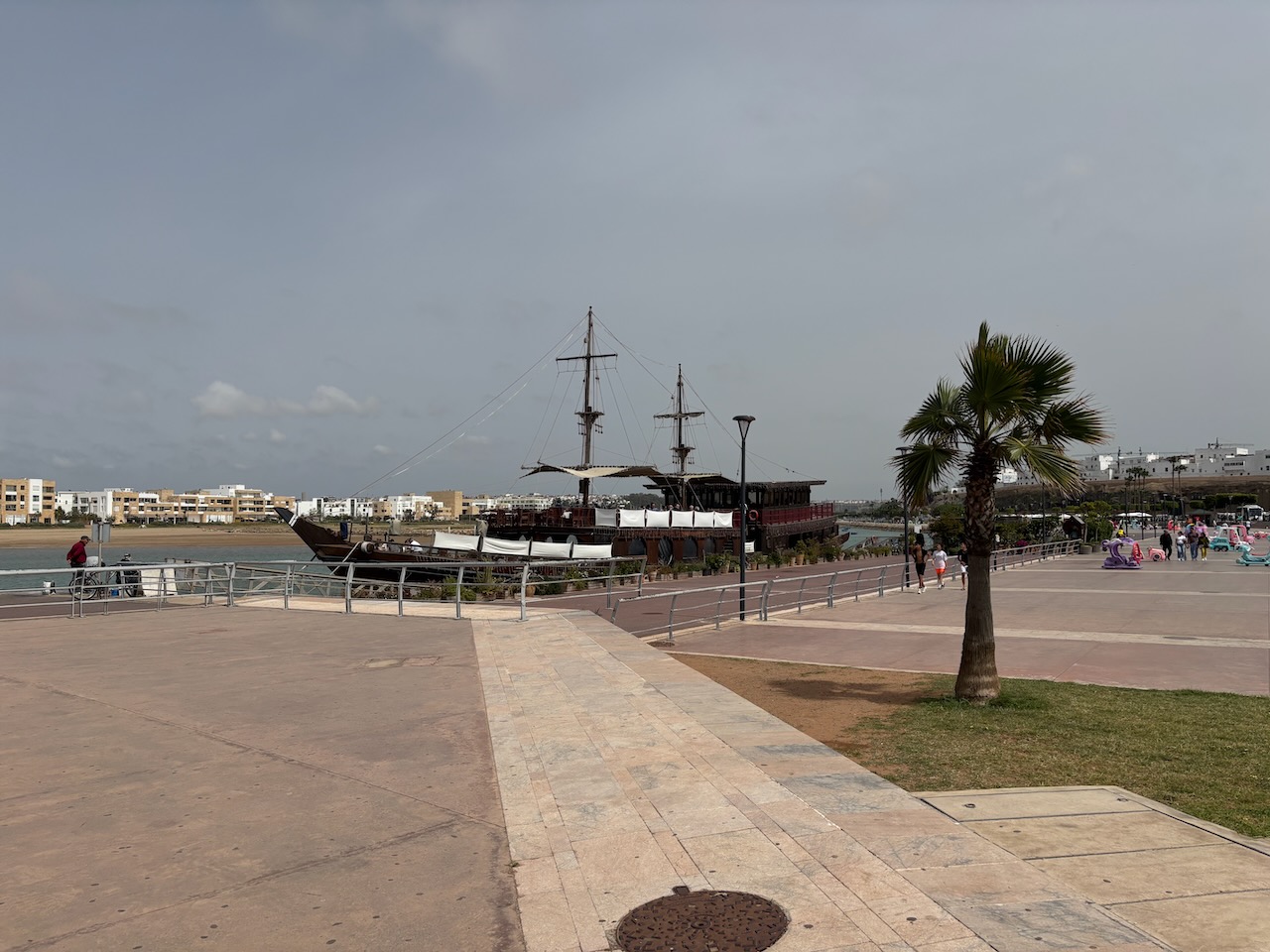We made our way down the wide and busy street that would lead us to the harbor, turning left at a roundabout beside the Borj Sidi Makhlouf, a fort that was first established in the 17th century and was destroyed in 1637 but conserved as it is today. It is located atop the cliff overlooking yhe Bouregreg river and it marked the transition from Andalusian to military architecture. It was then that I realized that I had left my long sleeve Patagonia Capilene shirt with the Dogfish Brewing artwork on it, one of many such shirts I own from the brewery. One of the only long-sleeved shirts I’d brought on the trip, Joanna volunteered to go back to the café and retrieve it, which she was able to successfully manage.